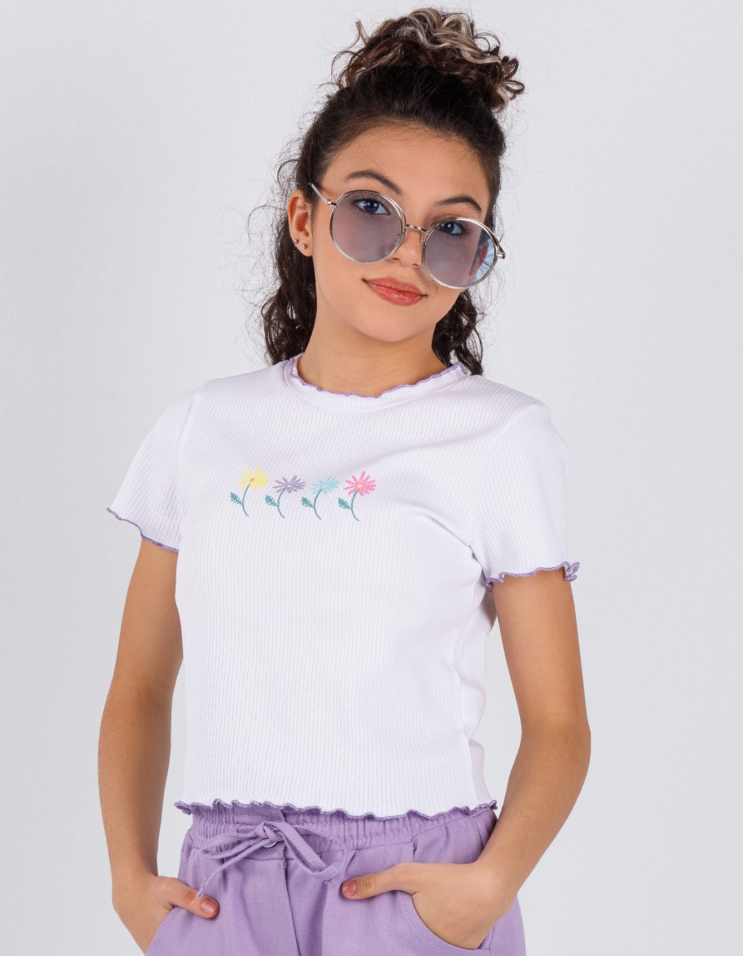 Укороченная футболка сшита из трикотажа "лапша" с нежным цветочным принтом. Края футболки обработаны оверлоком.