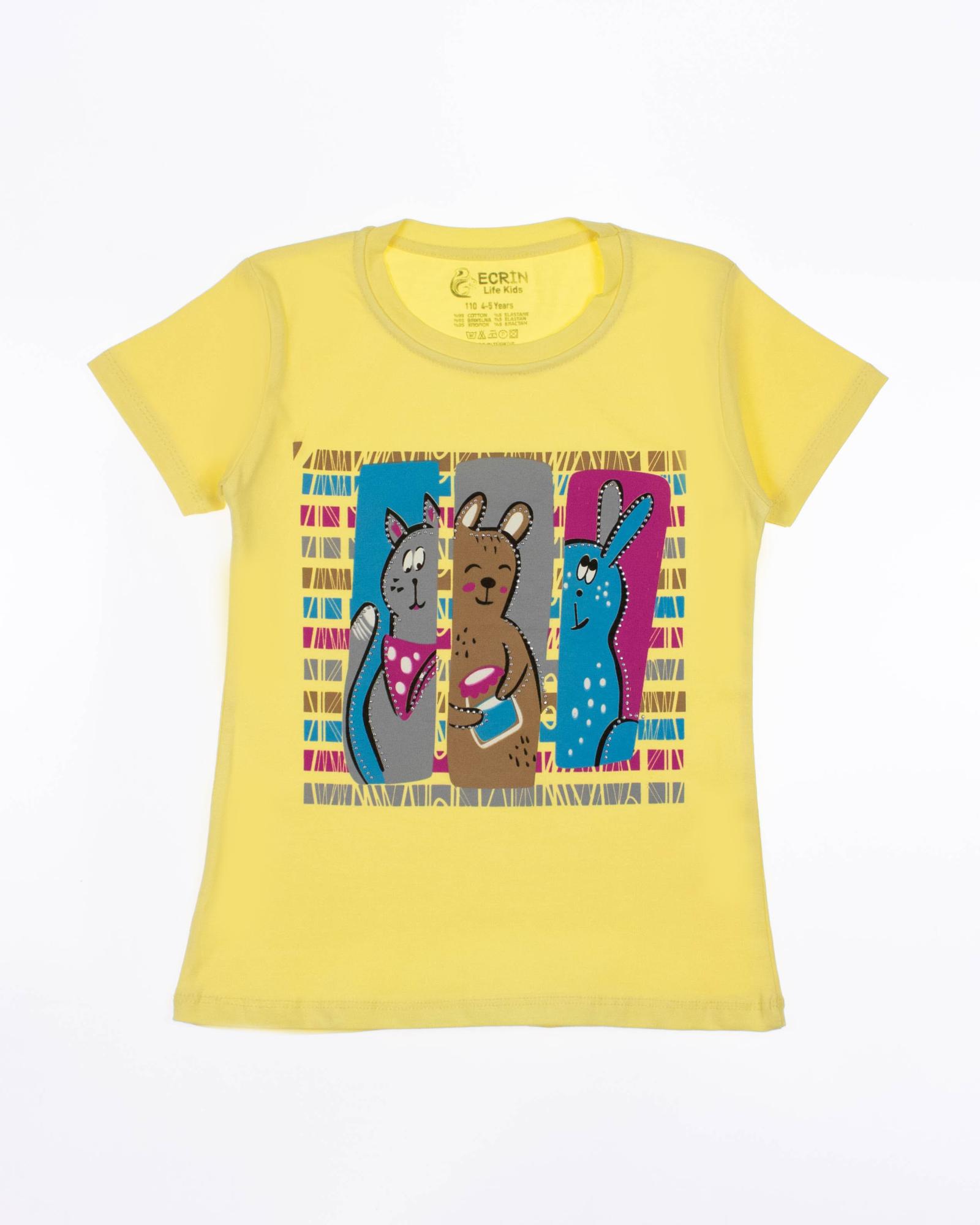 Футболка ECRIN для девочки оптом, производства Турция. Модель приталенного кроя из мягкого и эластичного трикотажа, принт украшен стразами.