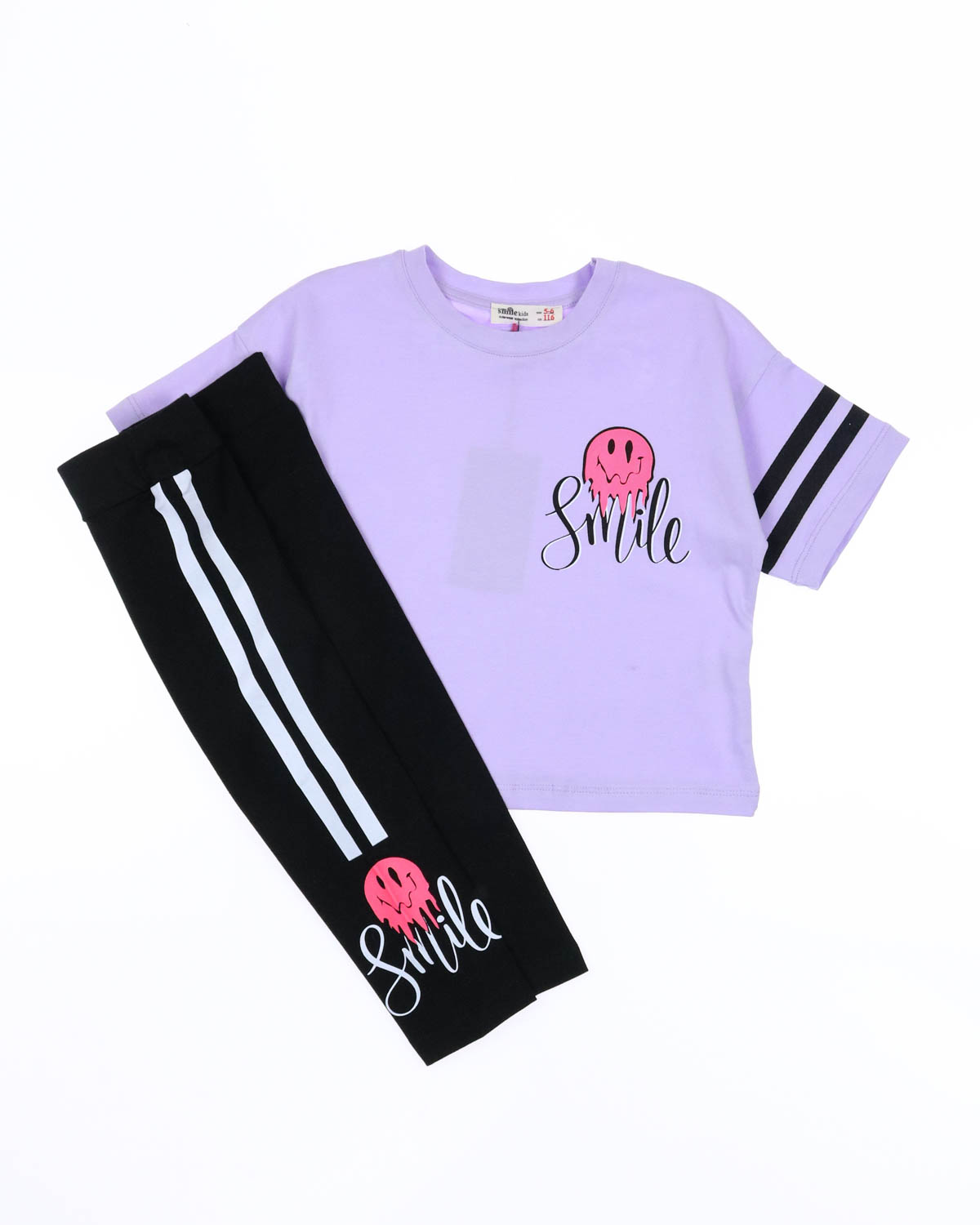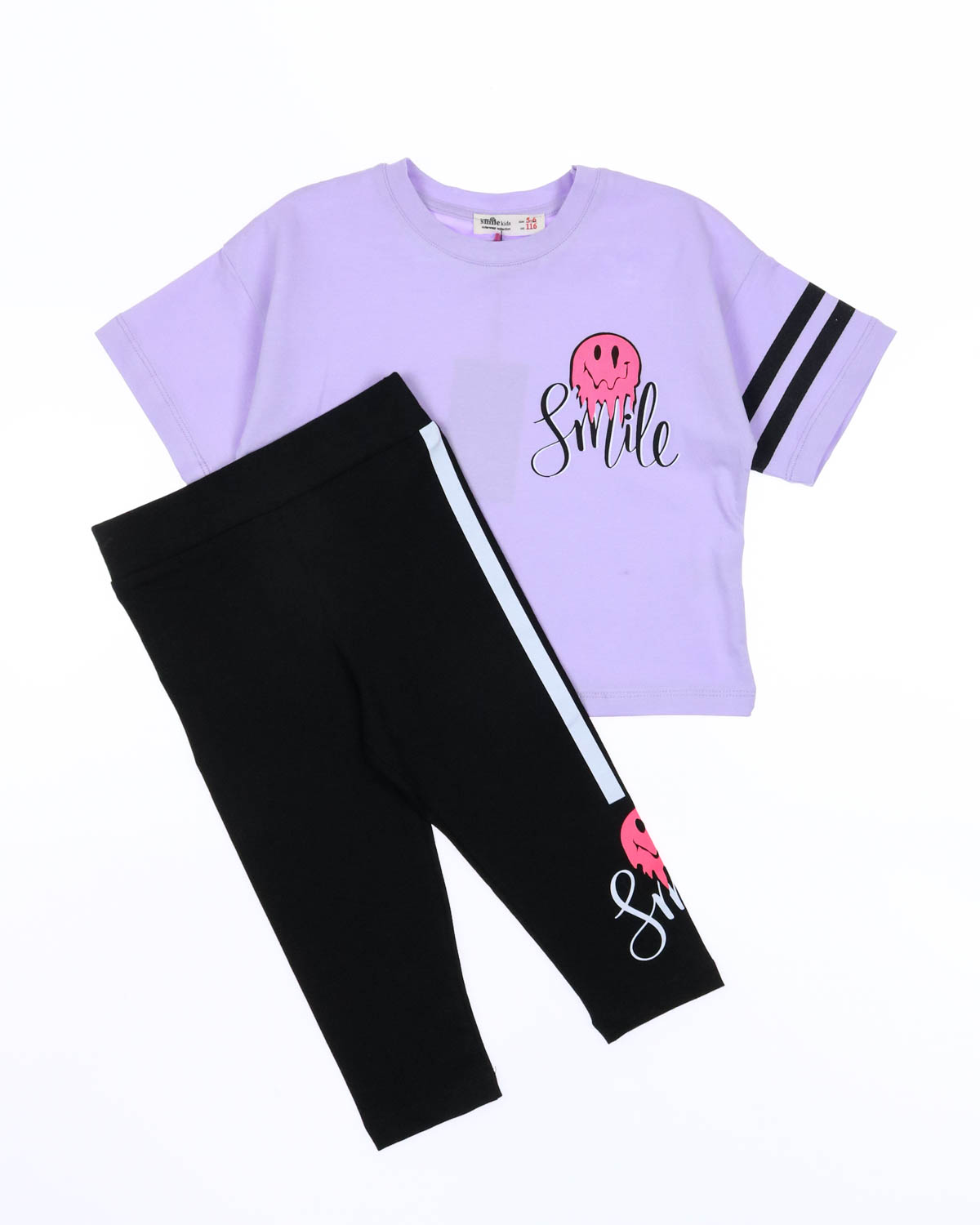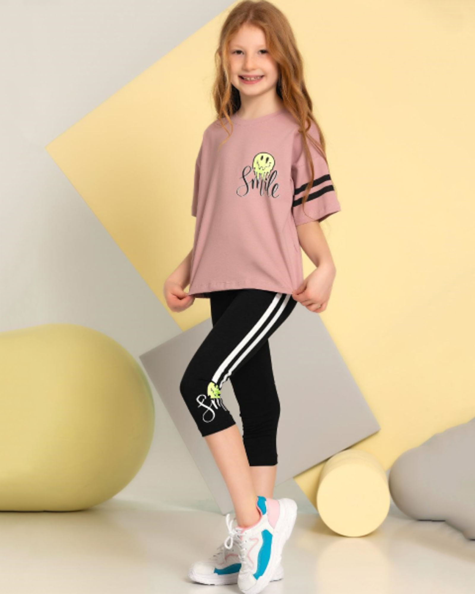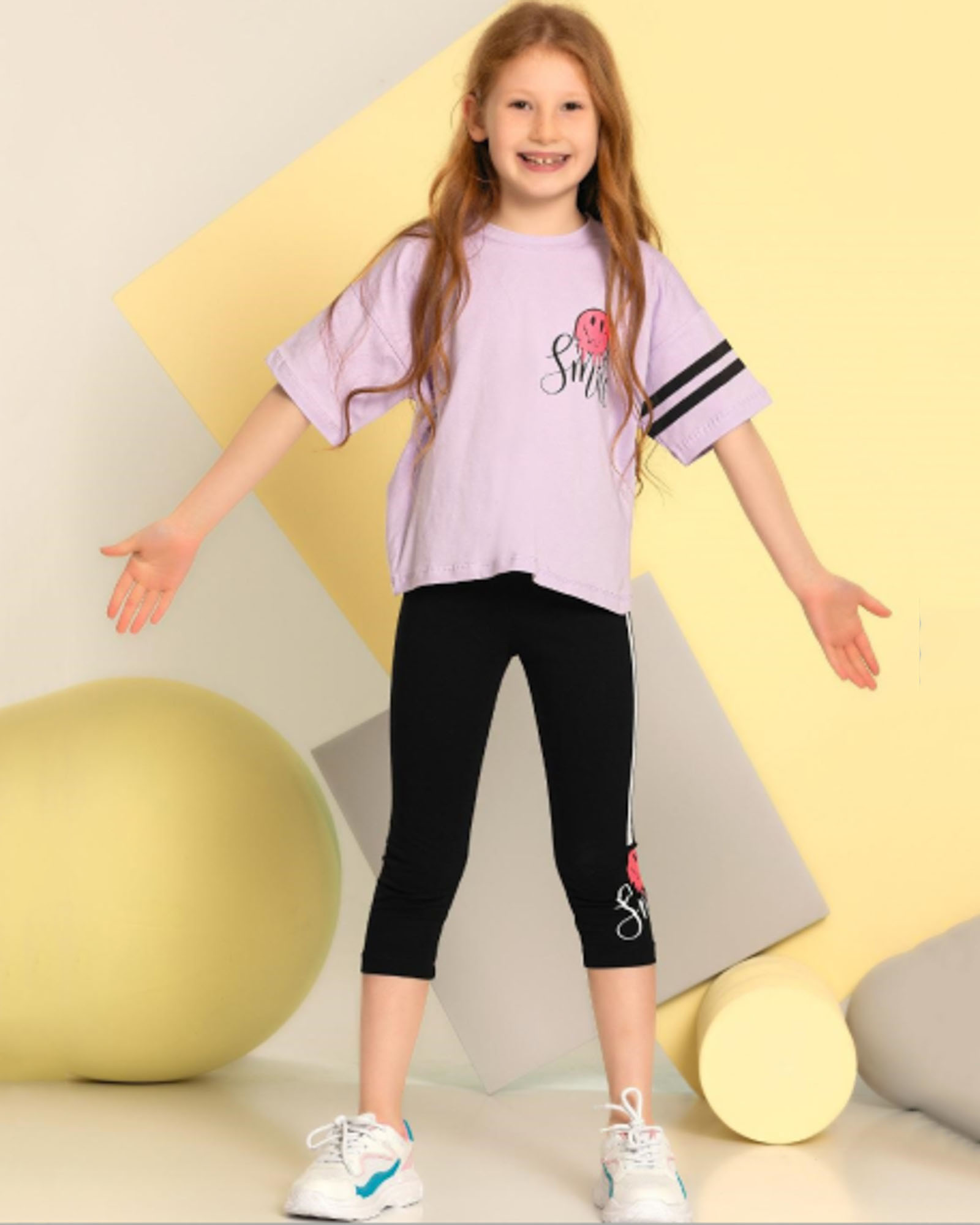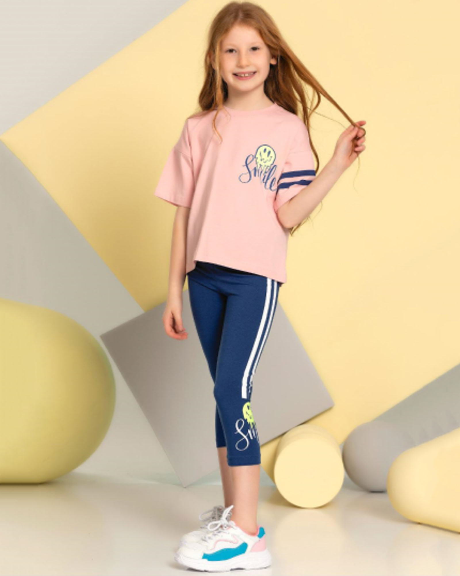 Укороченная футболка со спущенным рукавом  и бриджи делают летний комплект оригинальным и стильным.  Костюм выполнен из мягкого трикотажа кулирка.