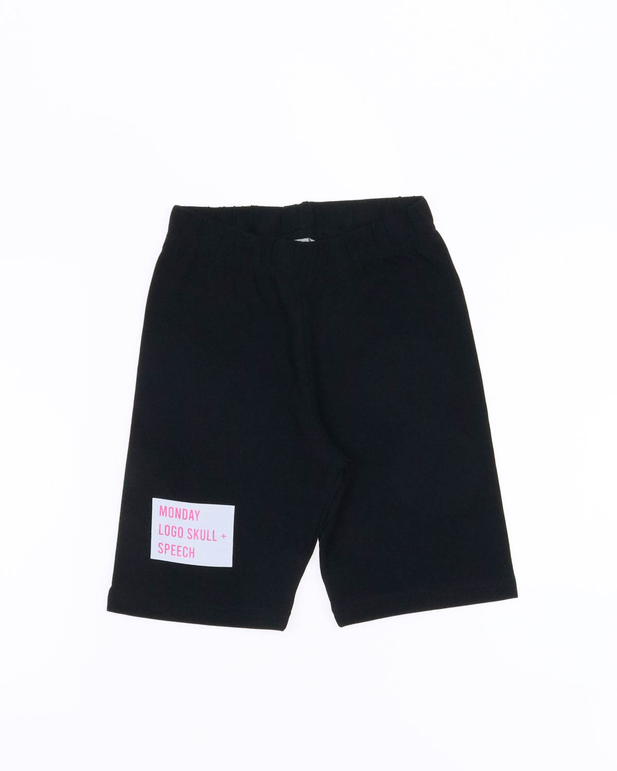Летний костюм для девочек с принтом MONDAY. Кофта со спущенными короткими рукавами, дополненая капюшоном, низ на шнурке и трендовые велосипедки. Изготовлен из хлопка с добавлением лайкры.