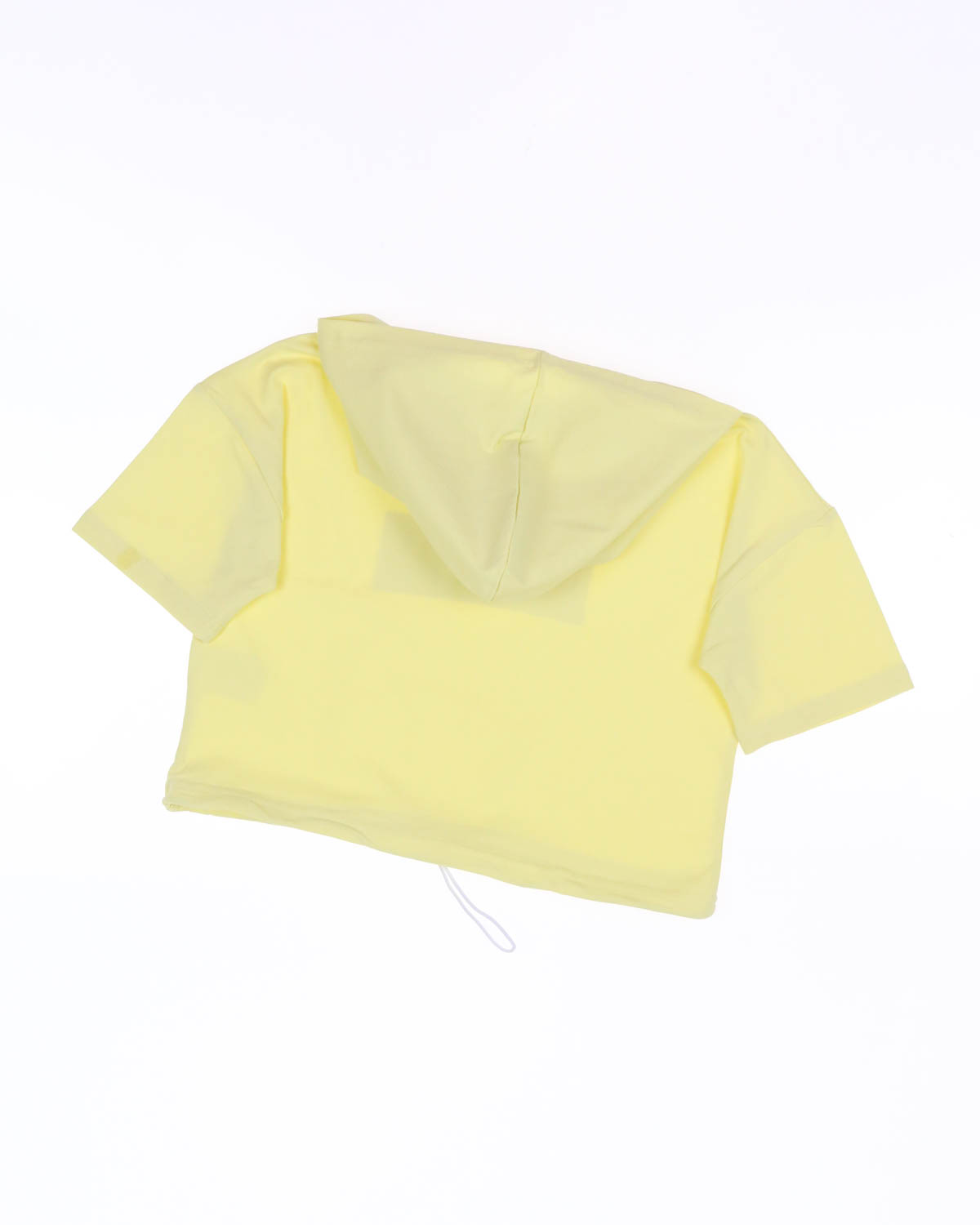 Летний костюм для девочек с принтом MONDAY. Кофта со спущенными короткими рукавами, дополненая капюшоном, низ на шнурке и трендовые велосипедки. Изготовлен из хлопка с добавлением лайкры.