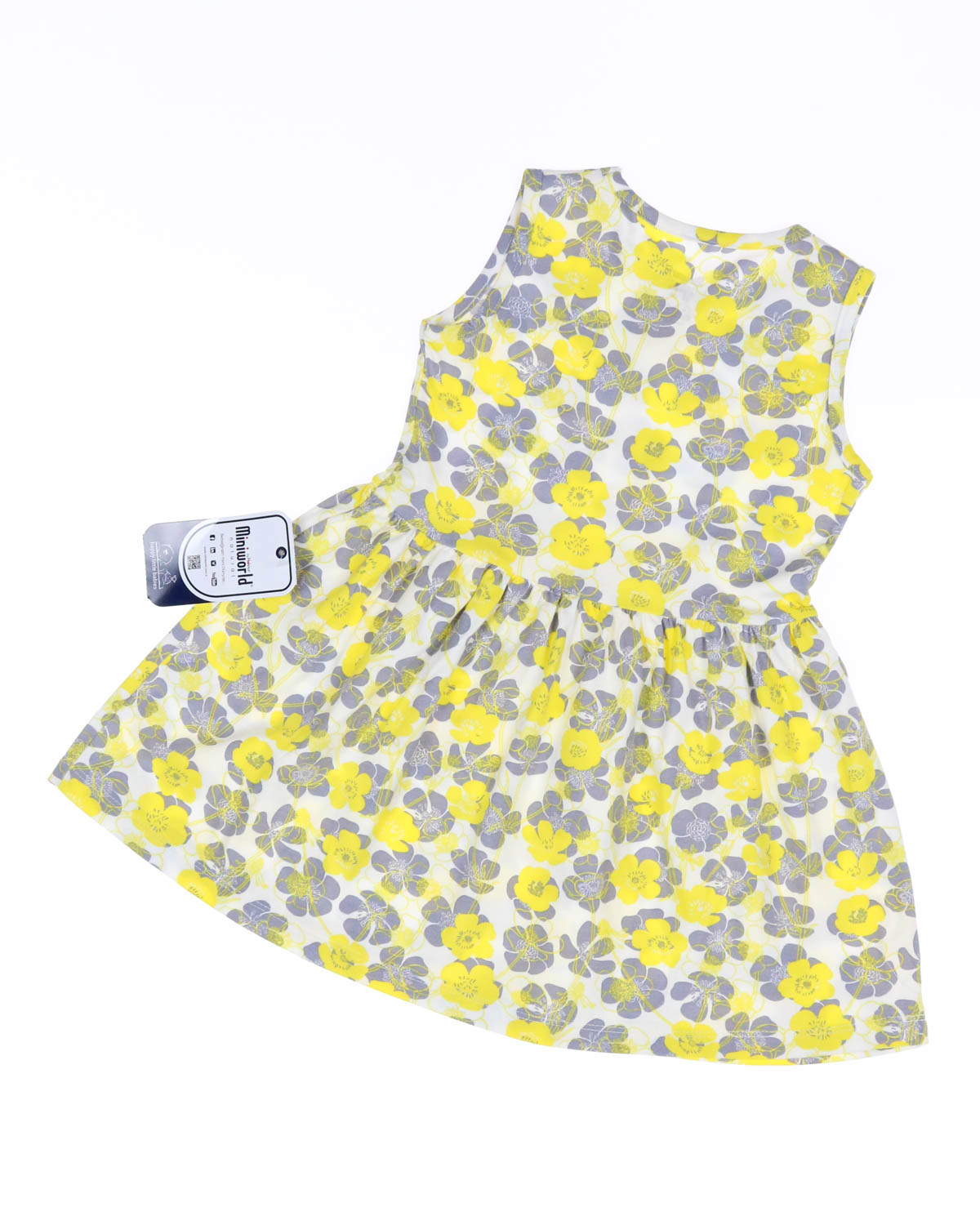 Летнее платье для девочки выполнено из эластичного хлопкового трикотажа. Платье без рукавов, расклешенное снизу, с принтом. Длина изделия выше колена.