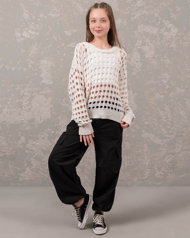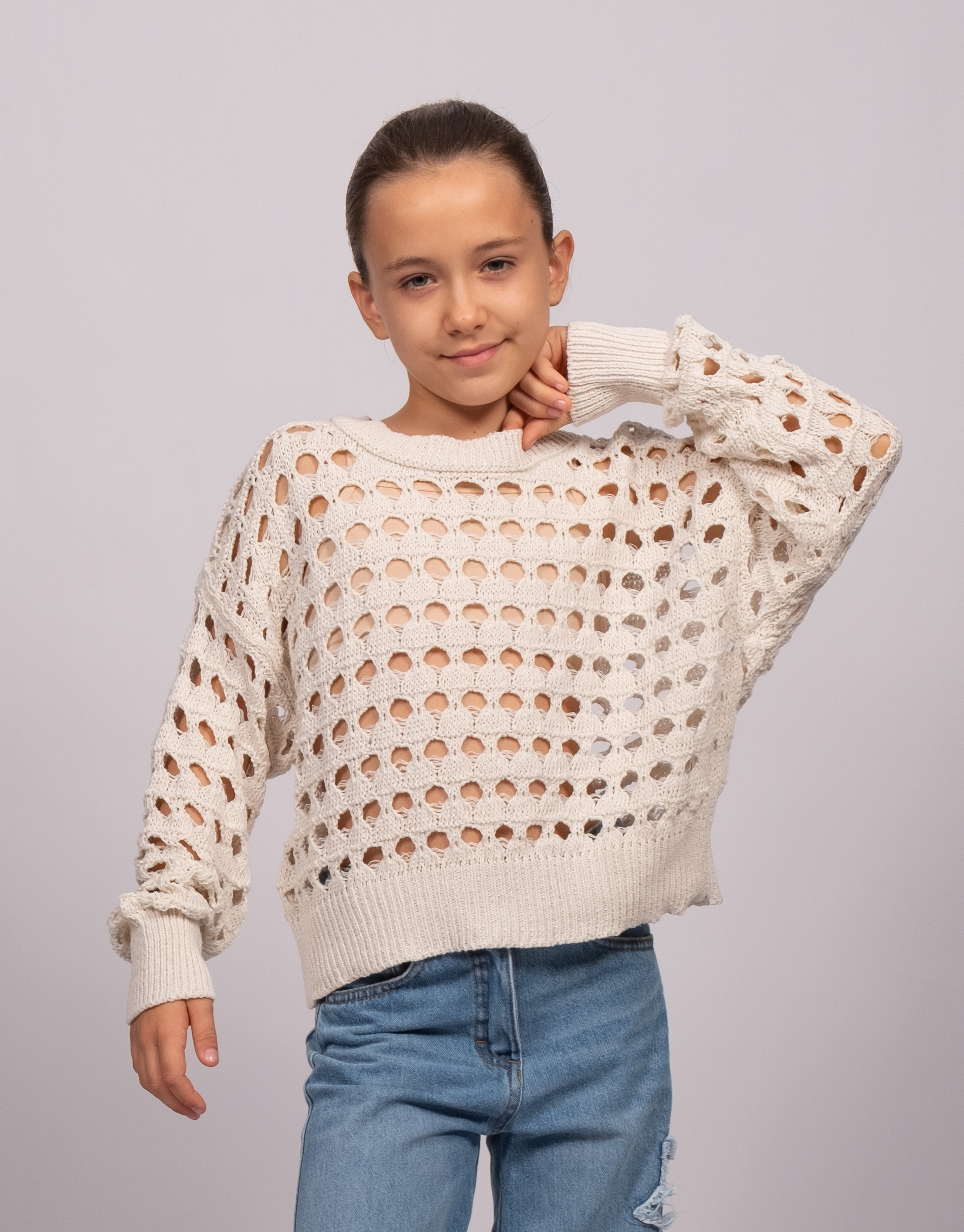 Джемпер DMB для девочек ажурной вязки оптом, выполнен из 100% хлопка. Свободный крой, круглый вырез горловины. Модель отлично сочетается с любой одеждой. Под низ можно надеть удлиненный или короткий топ в тон джемперу.