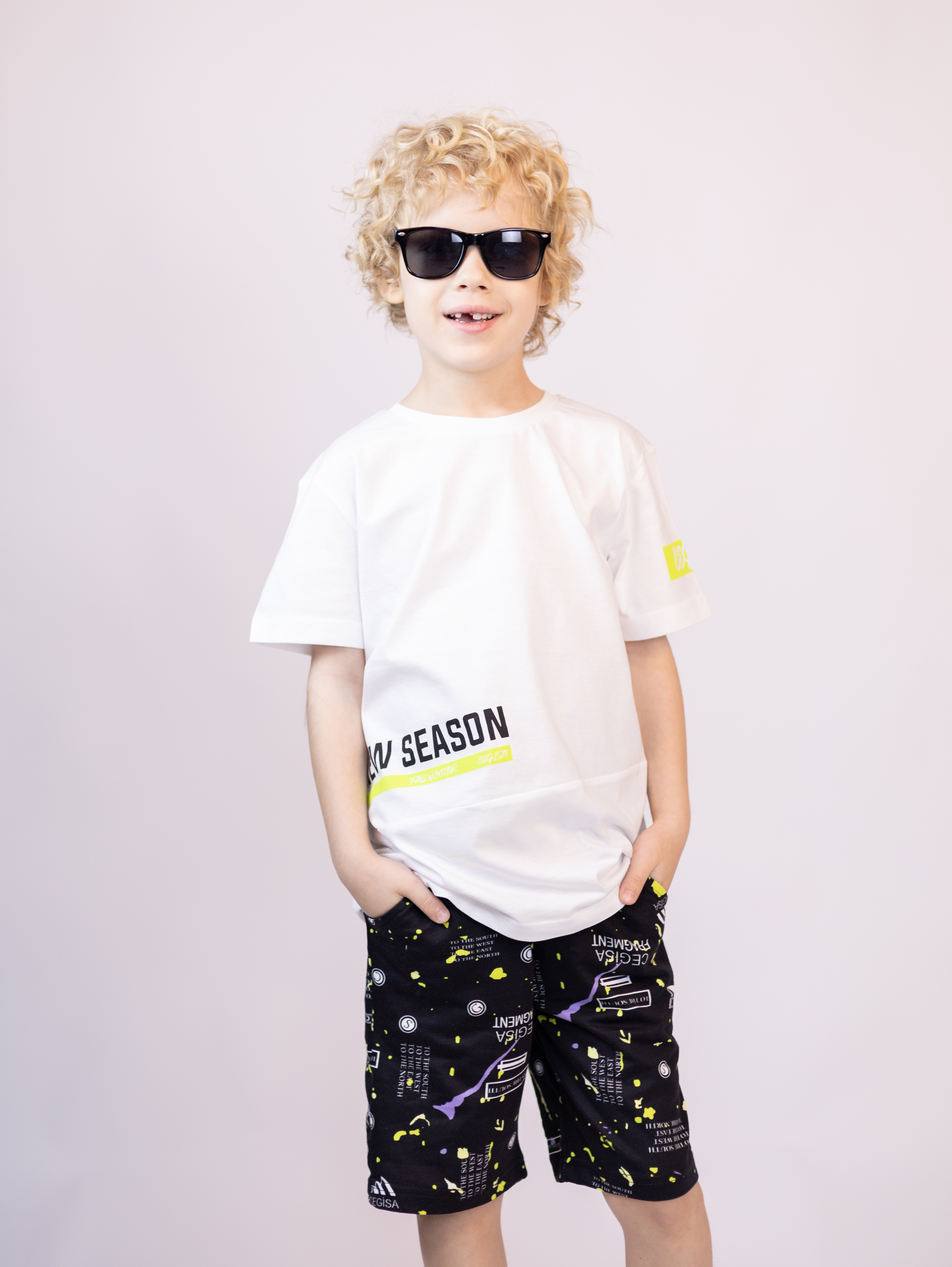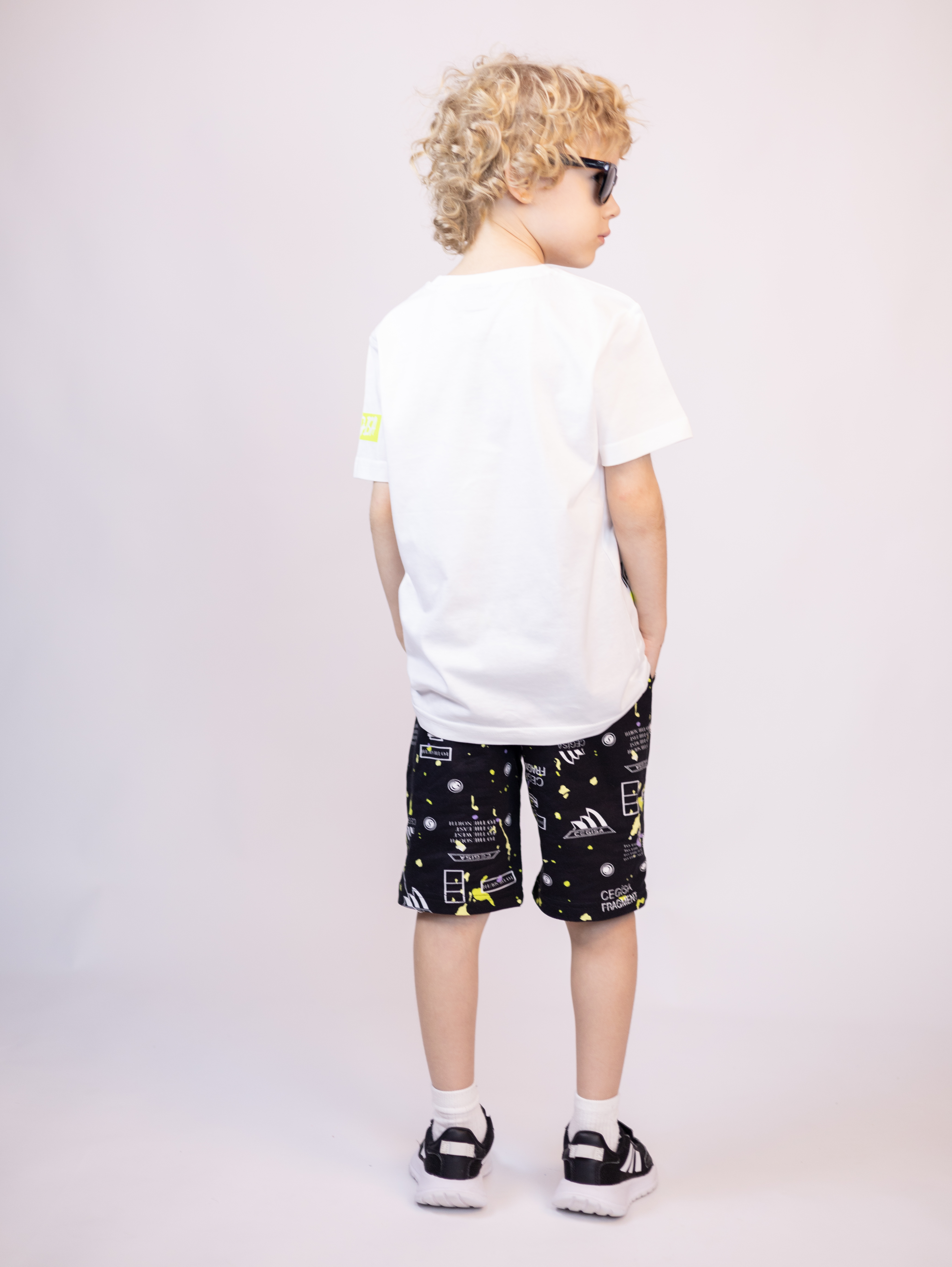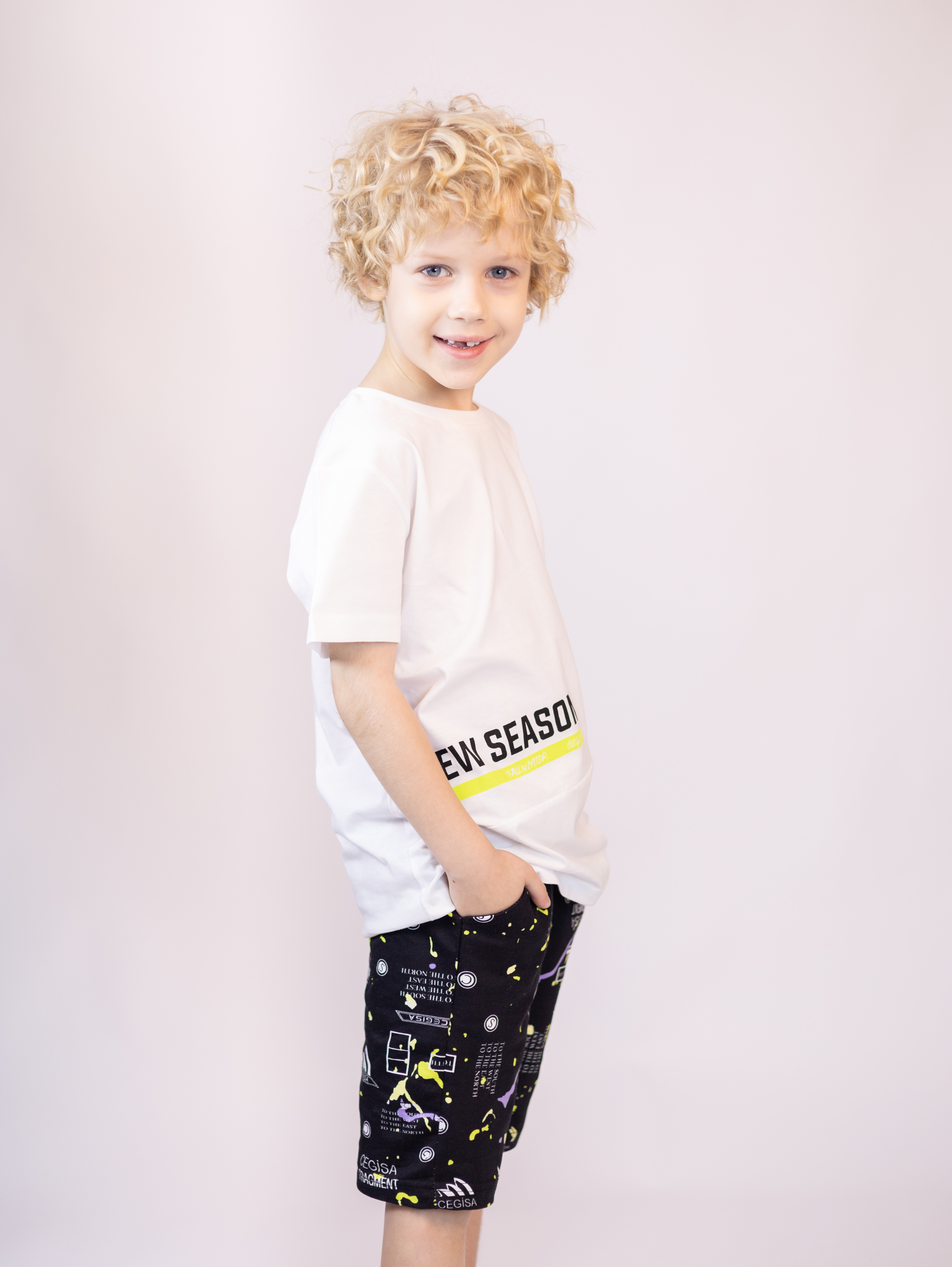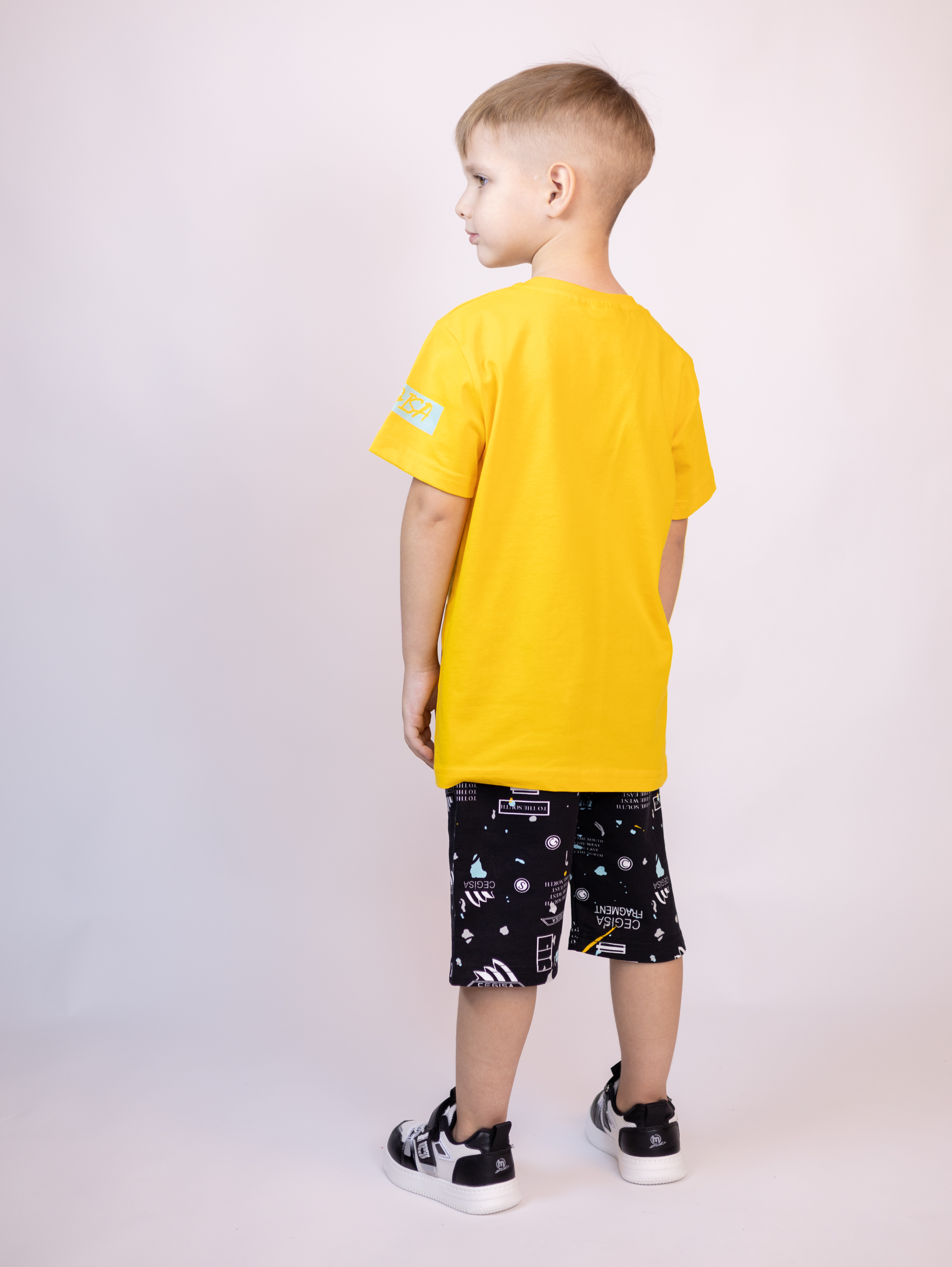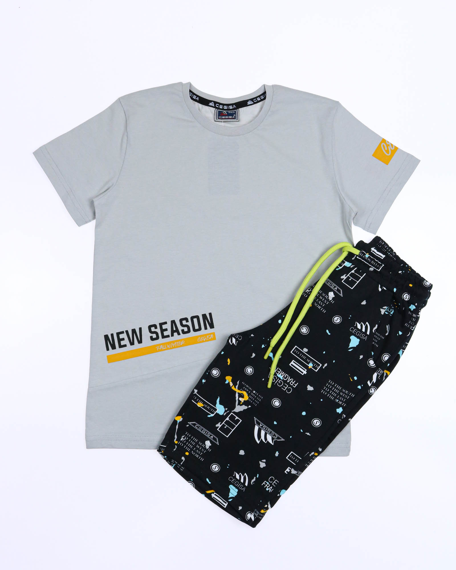Трикотажный костюм CEGISA из хлопка оптом. Бриджи выполнены из футера 2х нитки (петля) с карманами, на эластичном поясе с регулируемым шнурком и оригинальным принтом. Футболка выполнена из кулирной глади, прямого кроя с округлой горловиной.