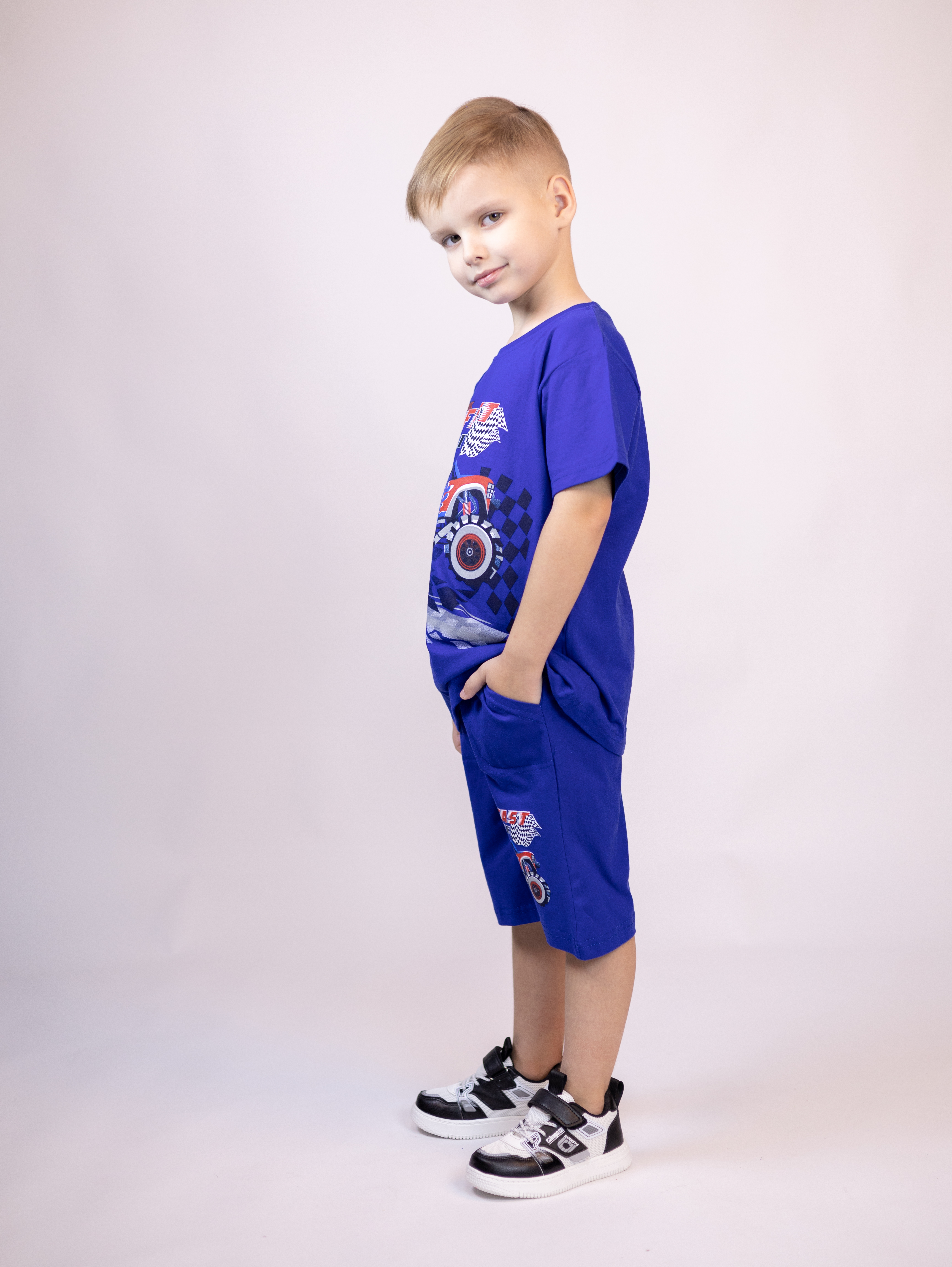 Трикожный костюм BOLD оптом из 100% хлопка с оригинальным, ярким принтом. Шорты трикотажные с карманами.