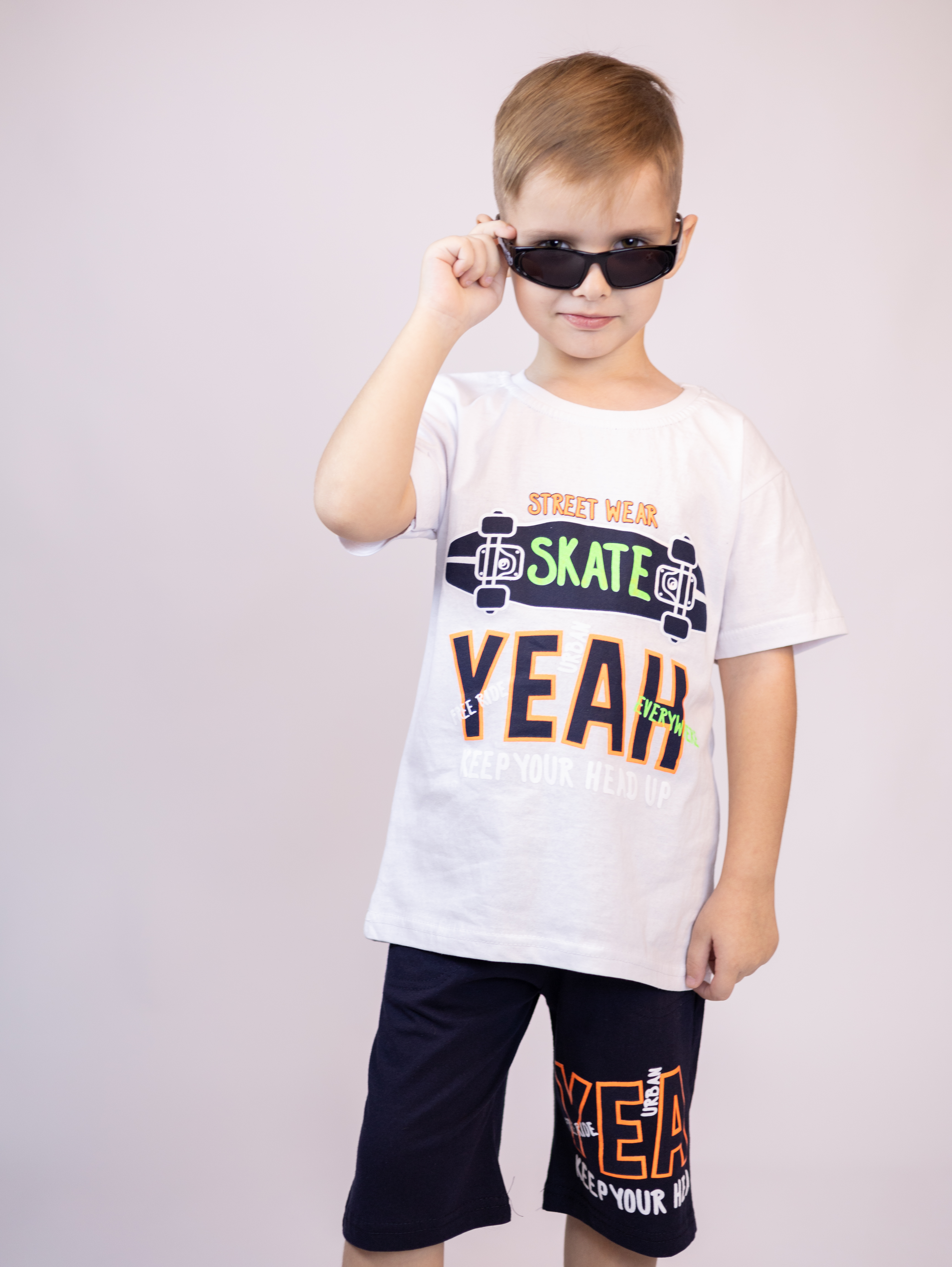 Трикожный костюм BOLD оптом из 100% хлопка с оригинальным, ярким принтом. Шорты трикотажные с карманами.