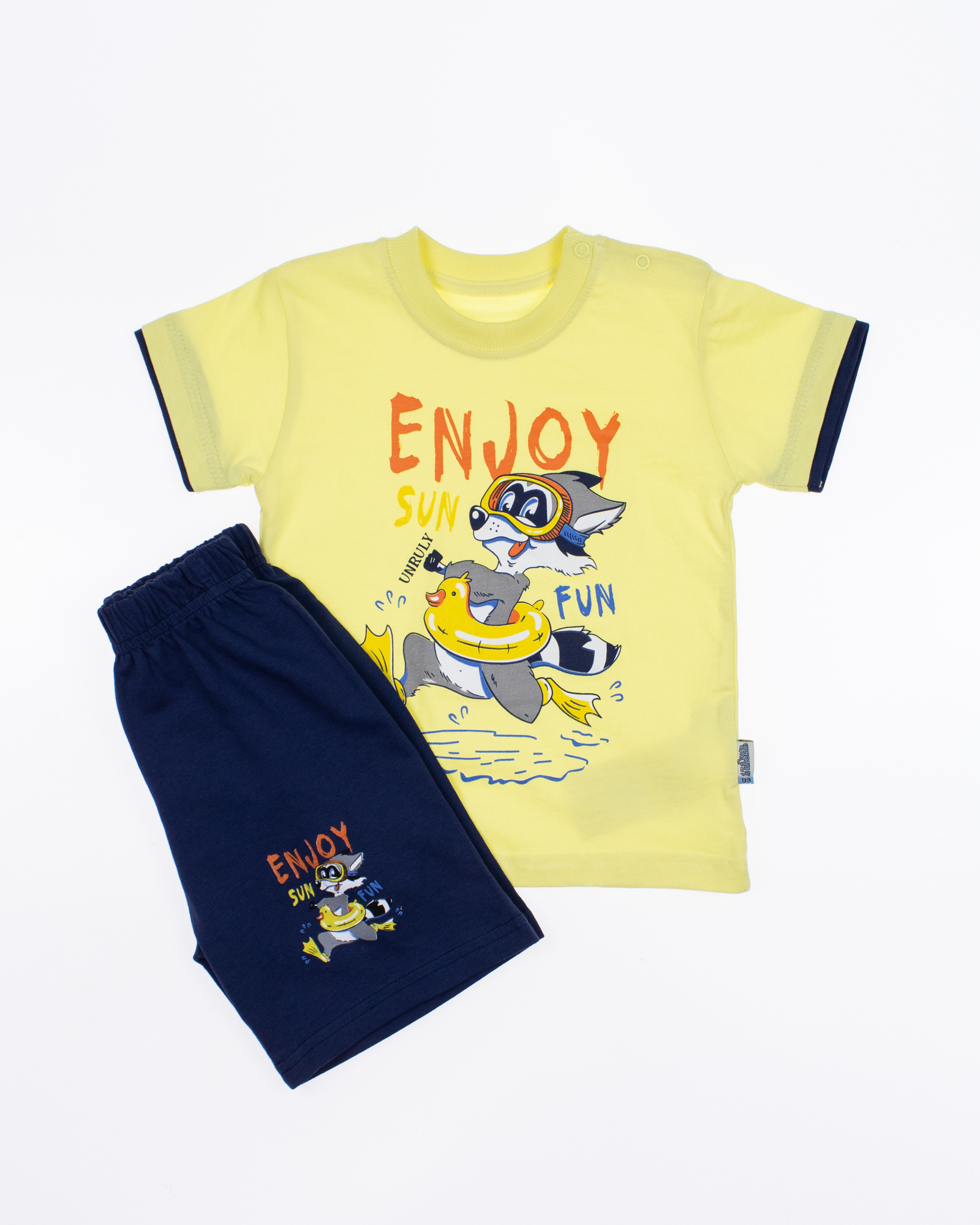 Костюм  Unruly для мальчика оптом, состоит из футболки и шорт. Модель выполнена из хлопкового полотна и оформлена печатным принтом. Футболка прямого кроя, с округлым вырезом горловины. Ткань кулирная гладь.