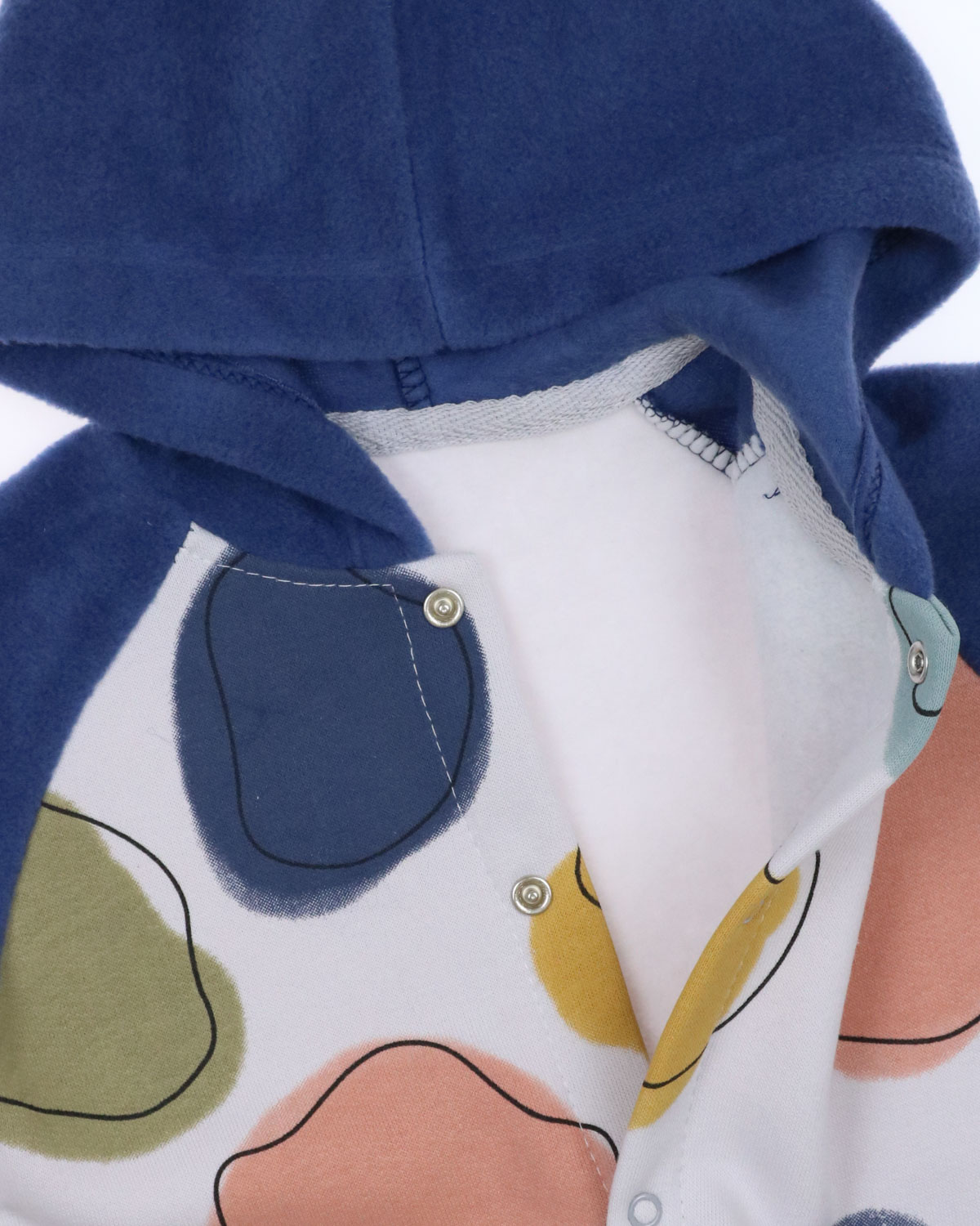 Детский комбинезон можно носить как самостоятельную одежду весной/осенью или утеплить ребенка в холодное время года. Комбинезон с закрытыми ножками не сковывает движений, имеет свободный крой и подходит для ношения подгузника. Комбинезон выполнен из трикотажа футер (начес), капюшон и рукава из флиса,застегивается на кнопки.