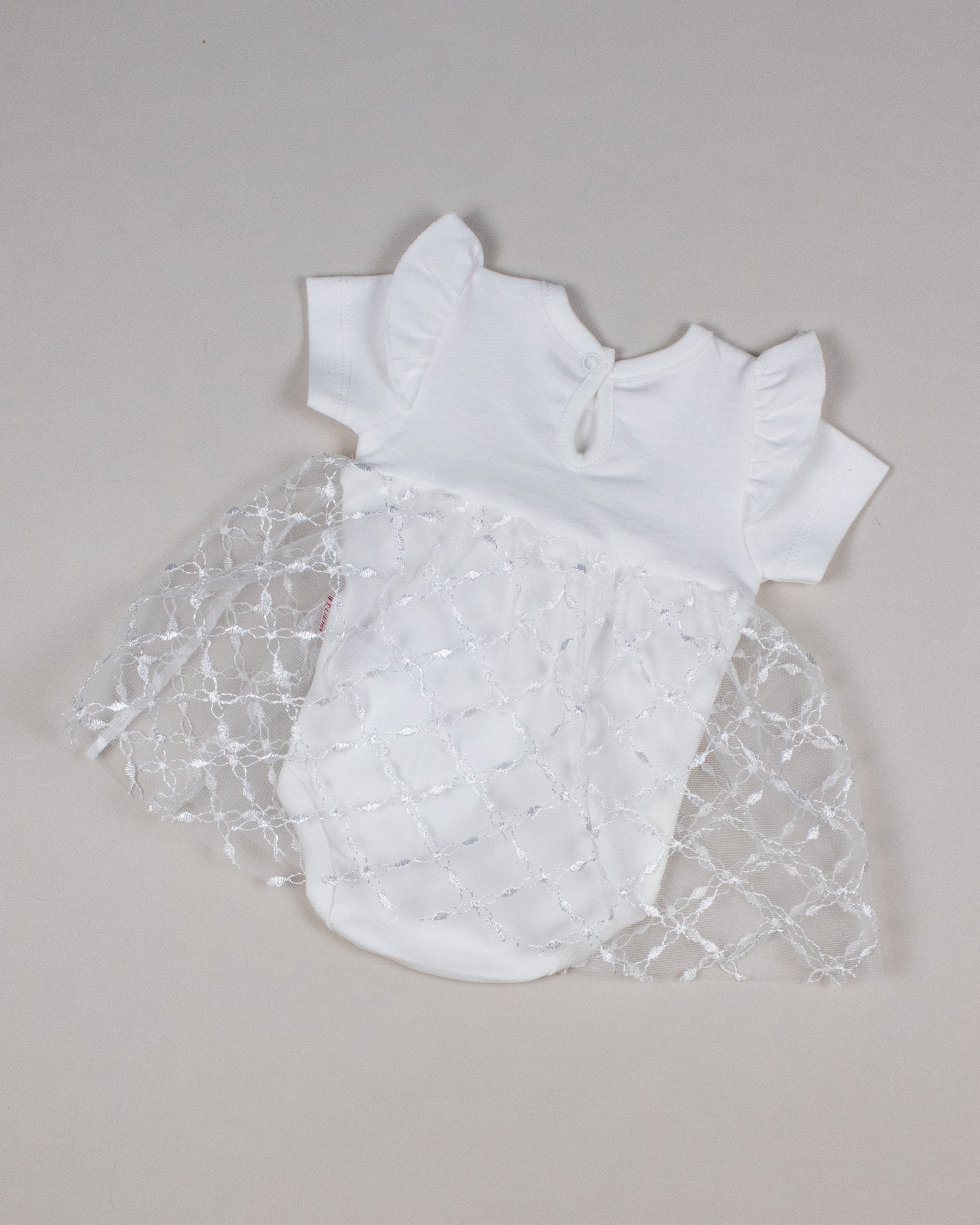Платье- боди PUAN  с коротким рукавом для малышки очень комфортно в использовании, не стесняет движений. Изготовлено из 100% хлопка. Застежка на спинке и снизу позволит в считанные секунды переодеть ребенка. Юбка выполнена из мягкого кружева.