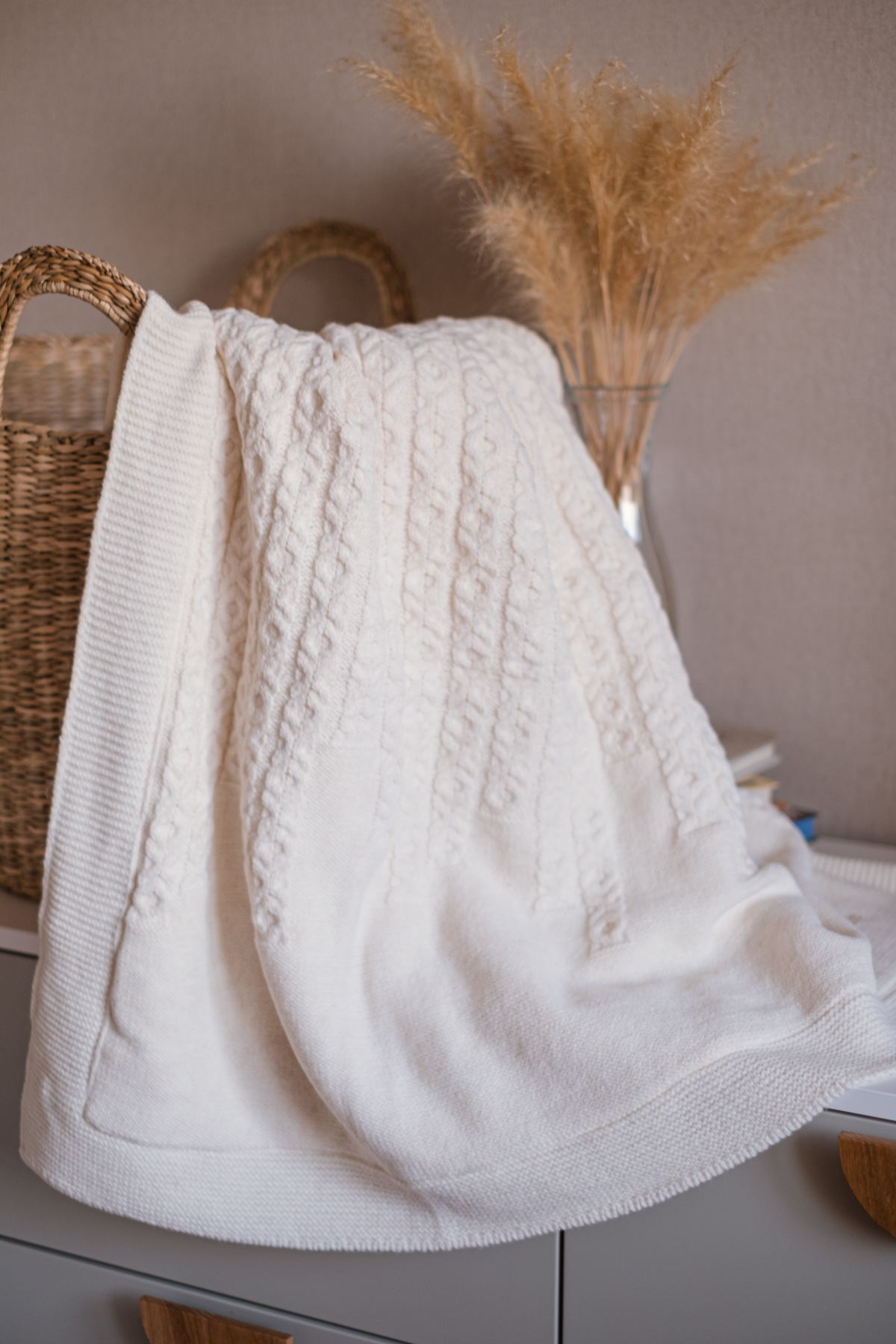 В составе этого пледа 20% шерсти. С лицевой стороны выполнен вязаный узор, а с изнаночной он утеплен подкладом из ткани вельбоа, ее еще называют искусственным плюшем. Она мягкая, теплая и приятная на ощупь.  Под таким пледом малыш точно не замерзнет.