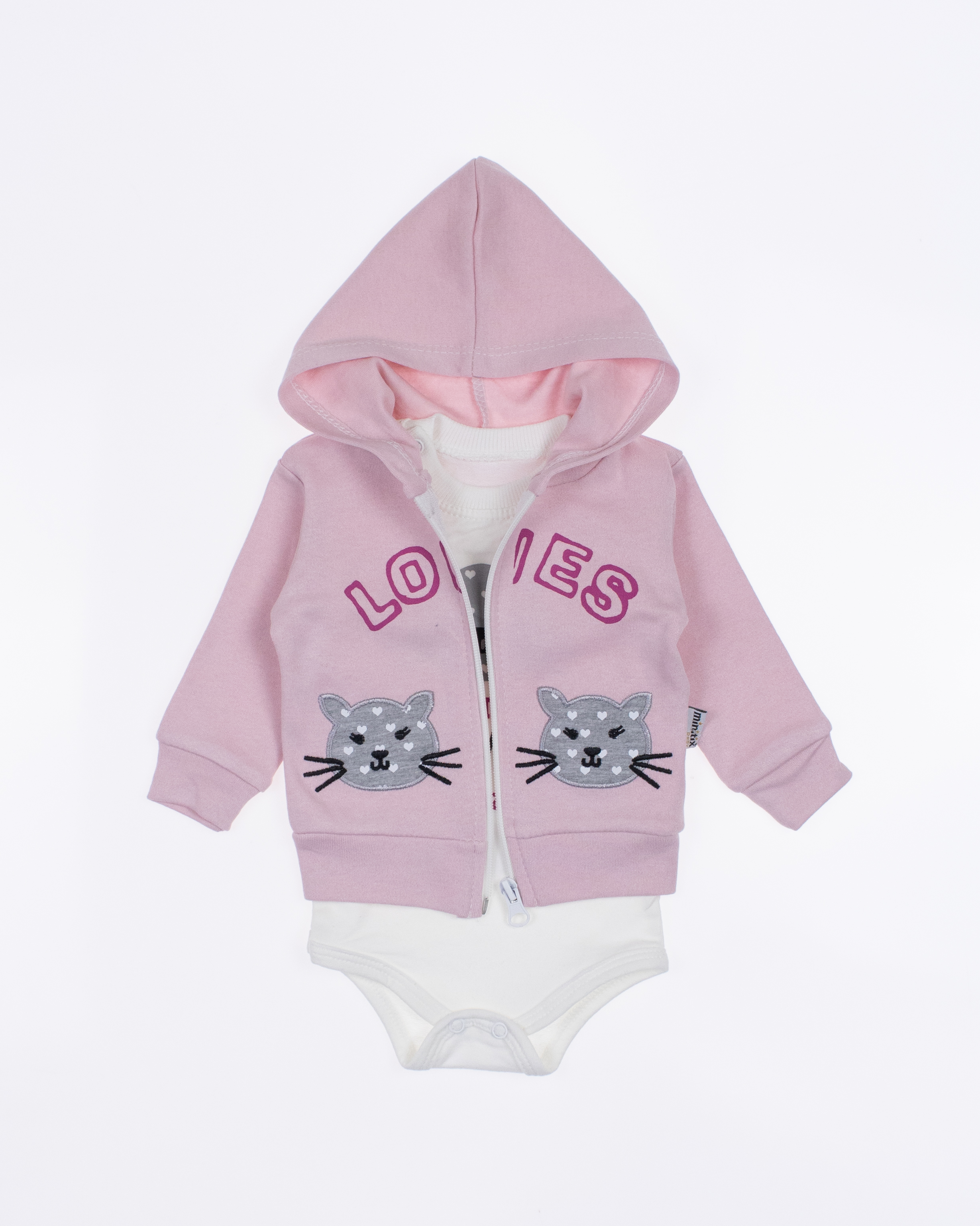 Костюм MINITIX с боди  для малышей очень комфортно в использовании, не стесняет движений. Изготовлено из 100% хлопка. Застежка  снизу позволит в считанные секунды переодеть малышку. Комфортная кофточка на молнии, штанишки на мягкой резинке на манжетах.