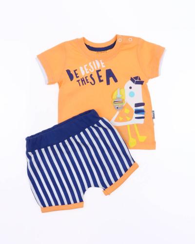 Удобный, красочный комплект для малыша. Выполнен из натурального, хлопкового материала. Футболка декорирована забавным принтом, на плече две кнопки для удобного переодевания. Шорты по талии на широкой, мягкой резинке.