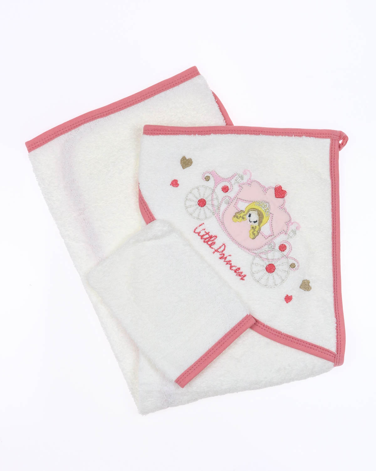 Полотенце с капюшоном и рукавица,  позволяет вытирать ребенка после купания так, чтобы его головка всегда оставалась в тепле. Благодаря петельке -   детское полотенце с капюшоном легко повесить сушиться, а варежкой можно вытереть ребёнка после кормления, а также утром после крепкого сна.  Детское полотенце из махровой ткани приятное на ощупь, отлично впитывает влагу и быстро сохнет. Капюшон декорирован милейшей аппликацией и вышивкой. Края детского полотенца обработаны хлопковой трикотажной окантовкой.