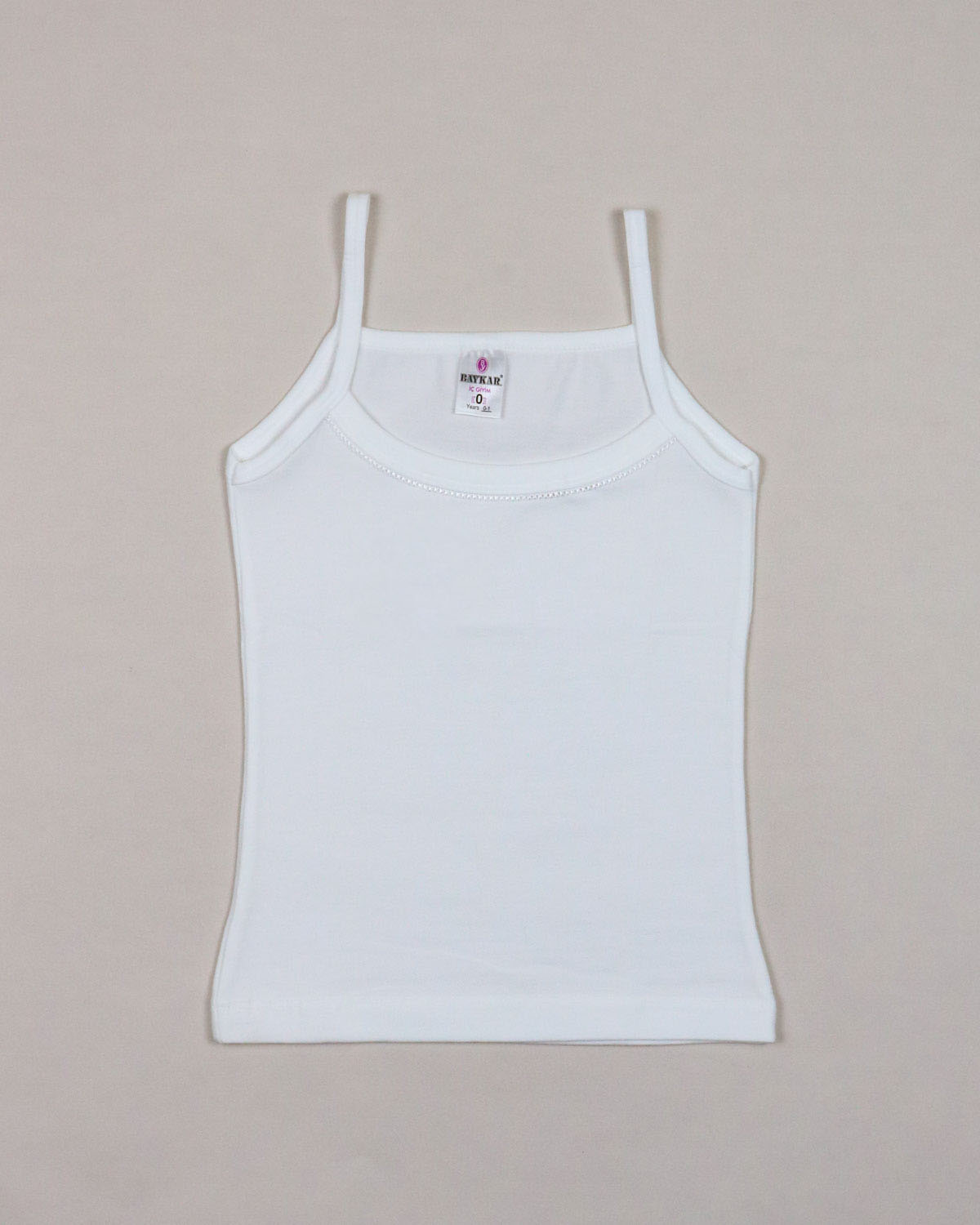 Белая бельевая майка для девочек отличного качества и комфортна при ношении. Однотонная майка без рисунка, классическая модель для ежедневной носки. Майка для девочки идеально под блузки белого цвета. Майка на тонких бретелях может использоваться как для сна ,так и  в школу под одежду . Ткань очень практична, комфортна и гипоаллергенна. Белье для девочек не мнется, хорошо тянется, сохраняя первоначальный вид после многочисленных стирок.