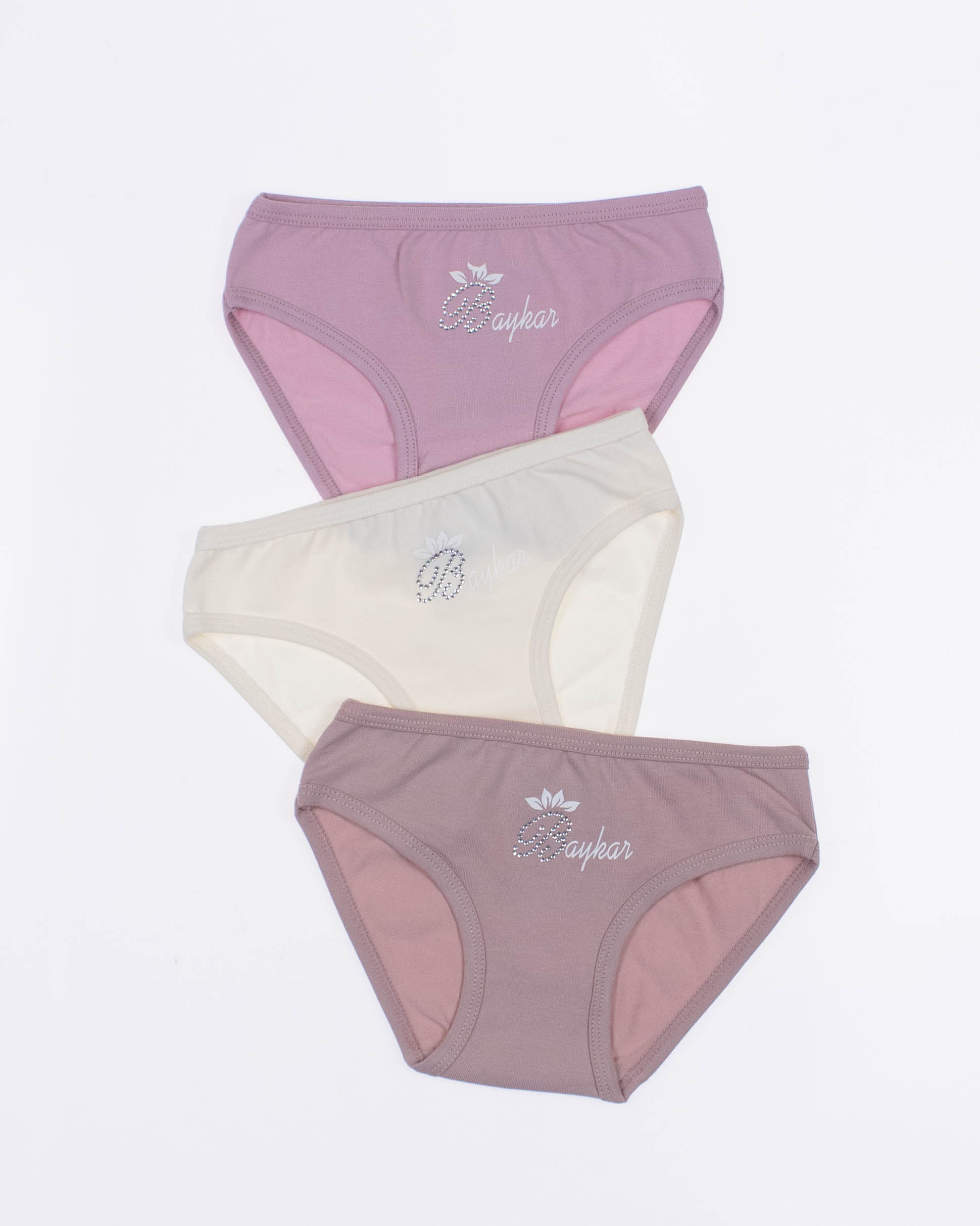Tрусики BAYKAR для девочки оптом в нежной цветовой гамме. Милый принт украшен стразами, резинки не впиваются в нежную кожу. Эластичное полотно прилегает к бедрам, натуральный хлопок обладает дышащими свойствами. Трусики представлены в трех пастельных оттенках.