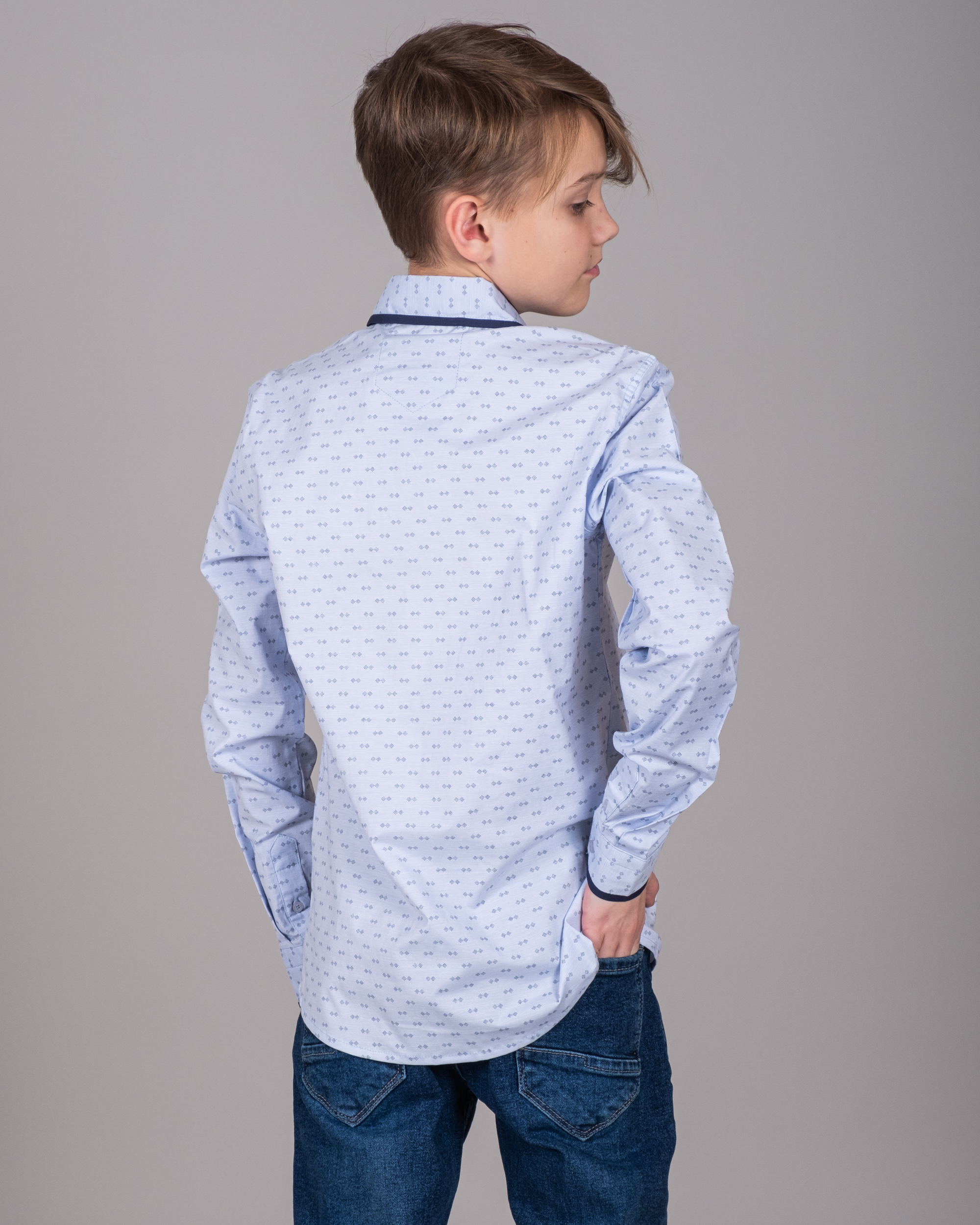 Рубашка прямого кроя с длинными рукавами, классическим отложным воротничком, застегивается на пуговицы. Воротничок и манжеты с внутренней стороны отделаны однотонной тканью темно- синего цвета.  На груди фирменная эмблема и  прорезной карман в рамке.