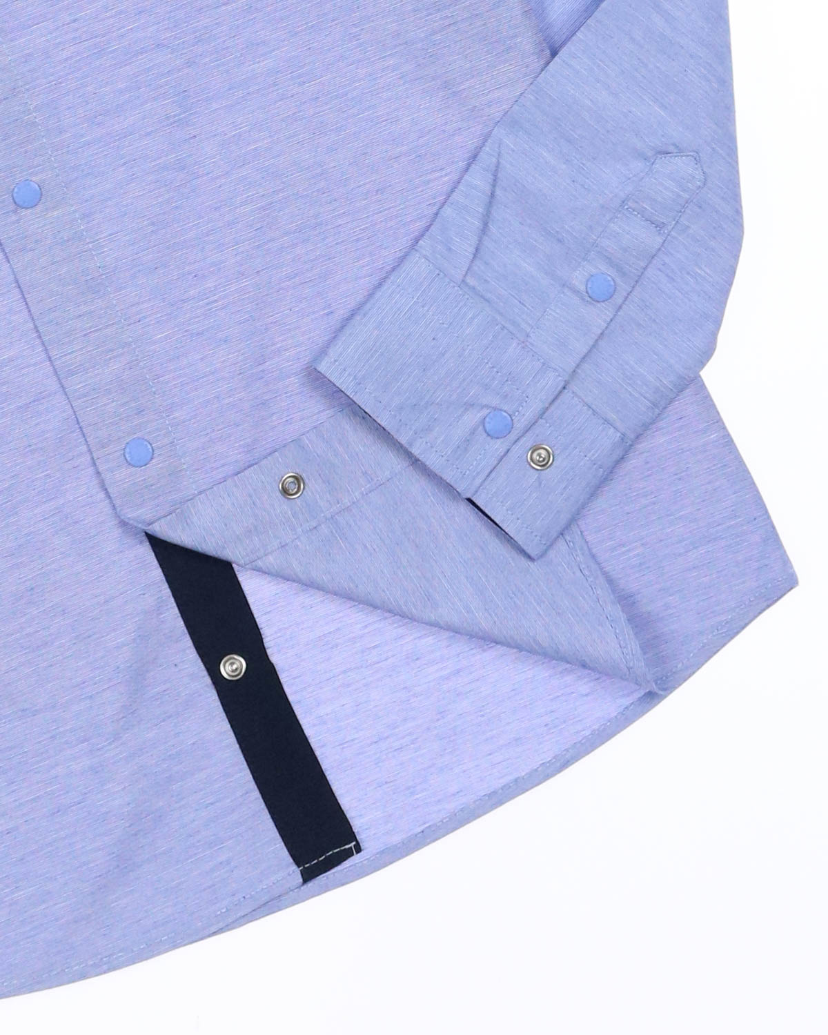 Рубашка для мальчиков прямого кроя с длинными рукавами и классическим отложным воротничком. Модель застегивается на кнопки. На груди расположена декоративная вышивка.