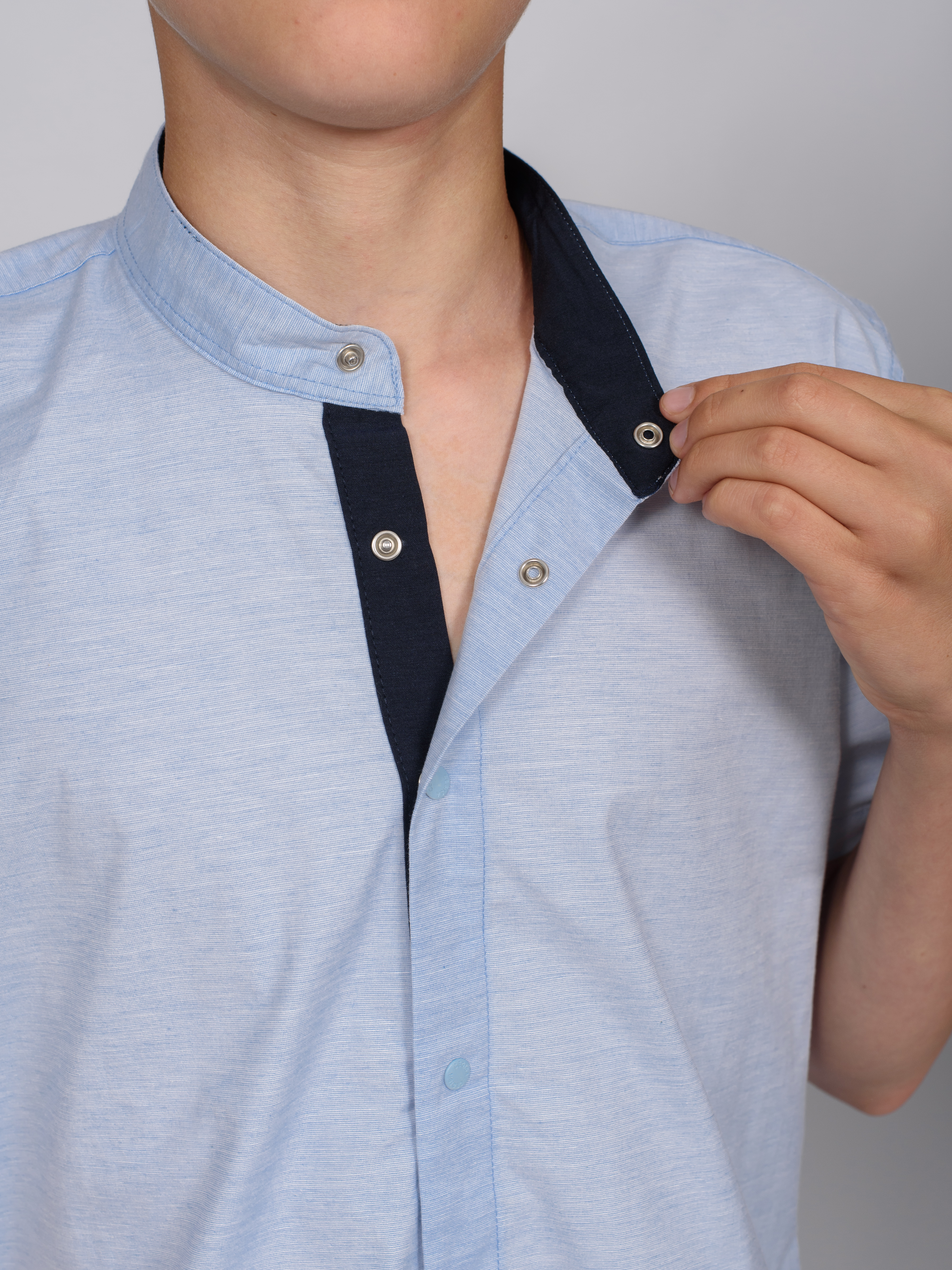 Школьная рубашка Cegisa оптом приталенного кроя с короткими рукавами, воротничком-стойка, застегивается на  кнопки. Воротничок и планка с внутренней стороны отделаны однотонной тканью темно-синего цвета.