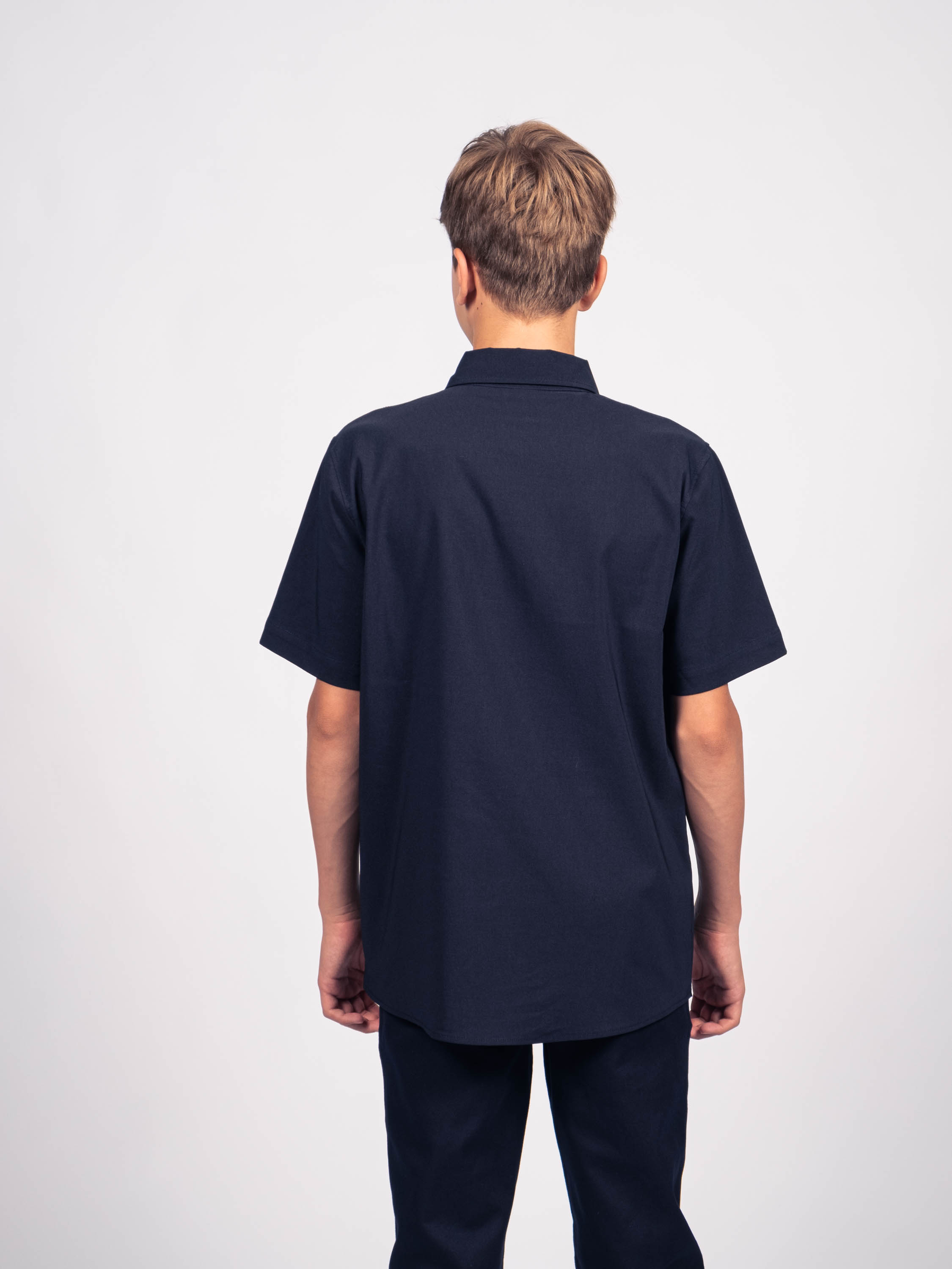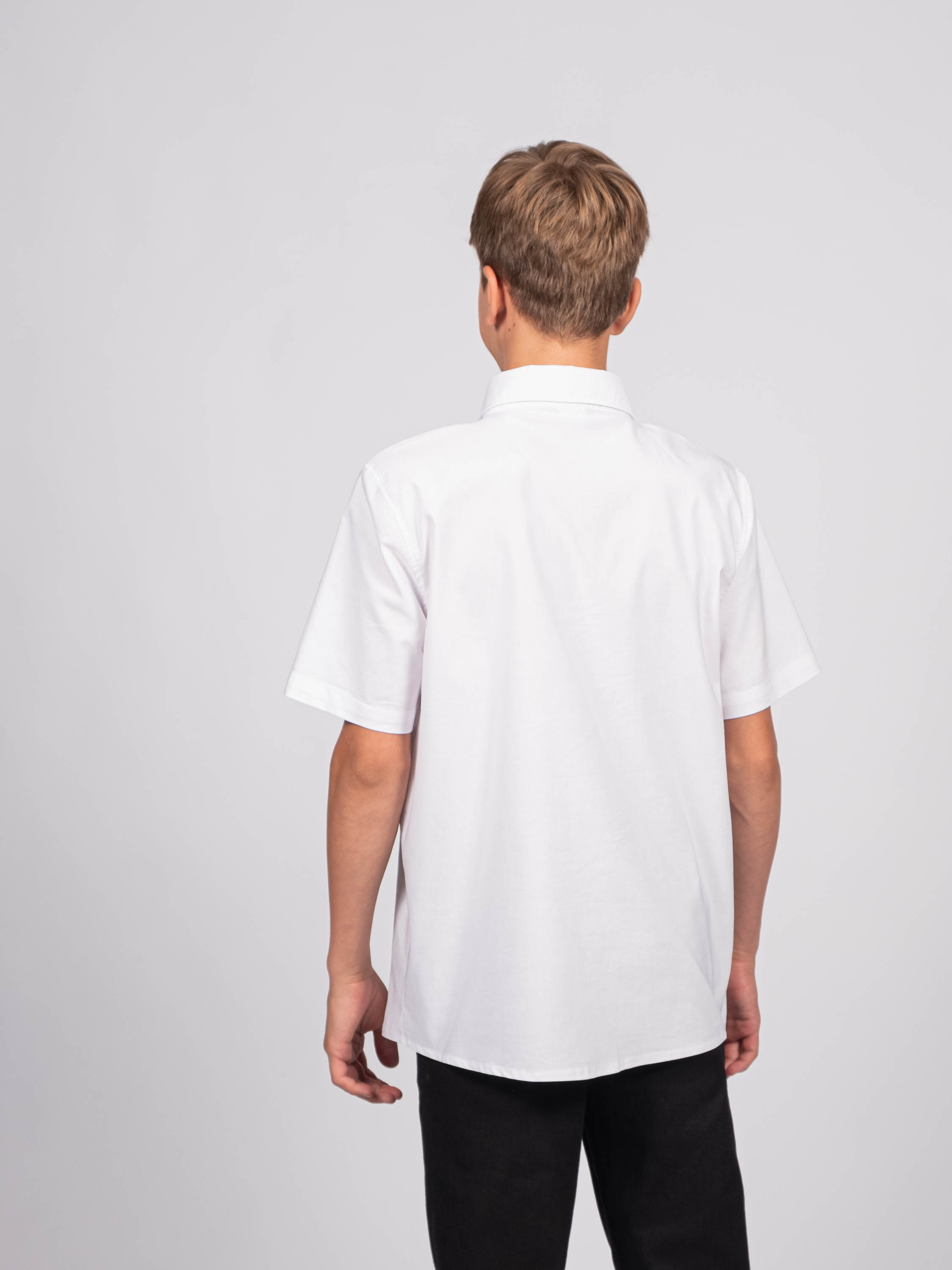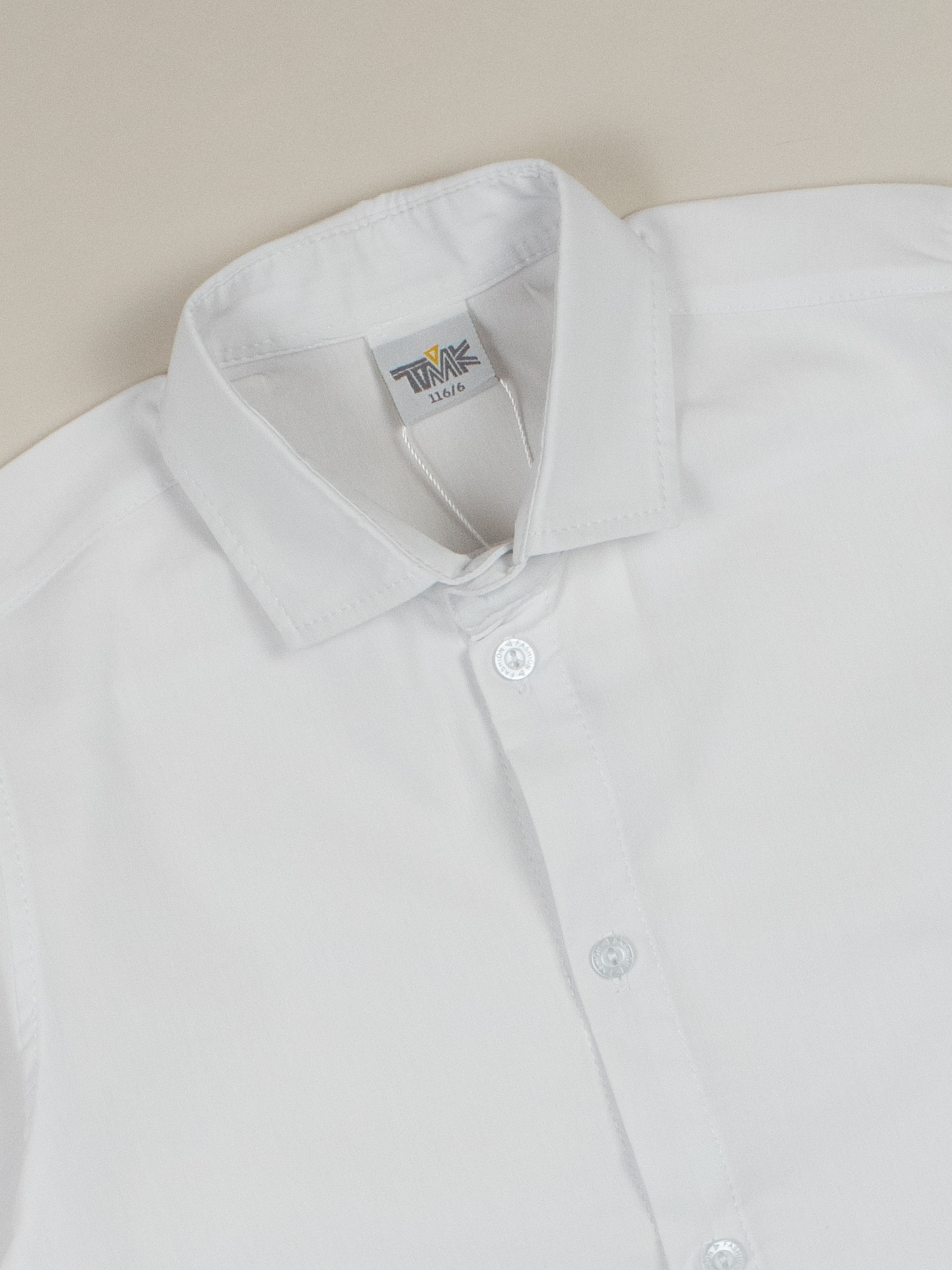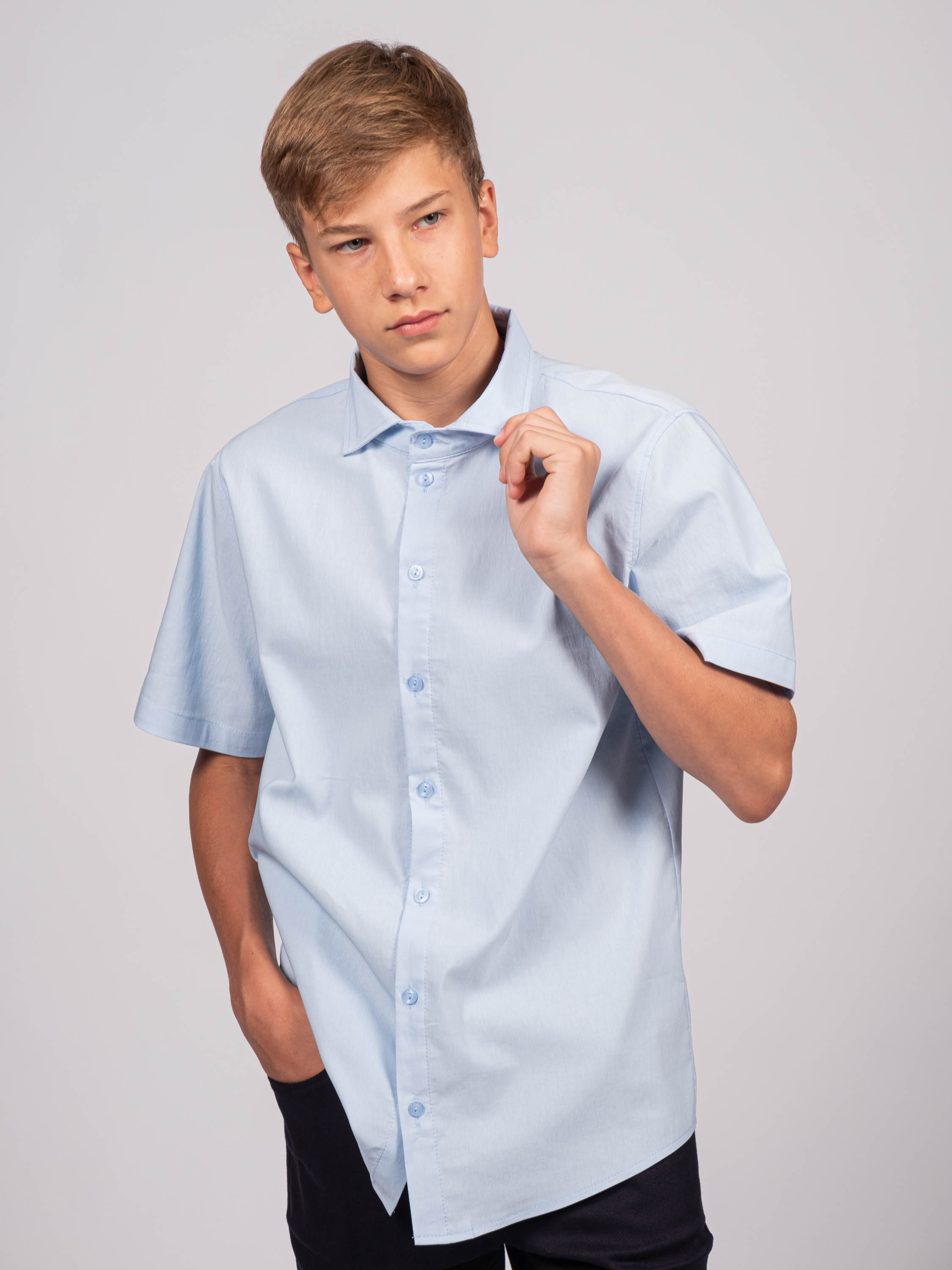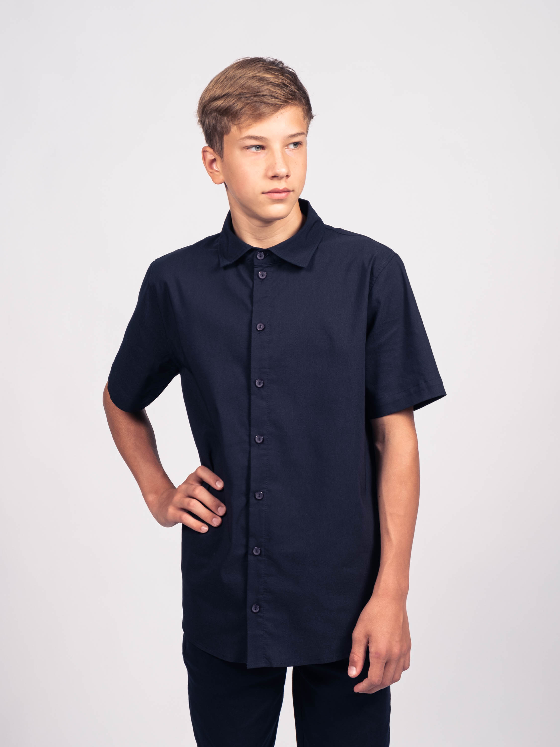 Детская однотонная рубашка для мальчиков оптом. Рубашка изготавлена из смесового материала высокого качества. Модель застегивается на пуговицы.